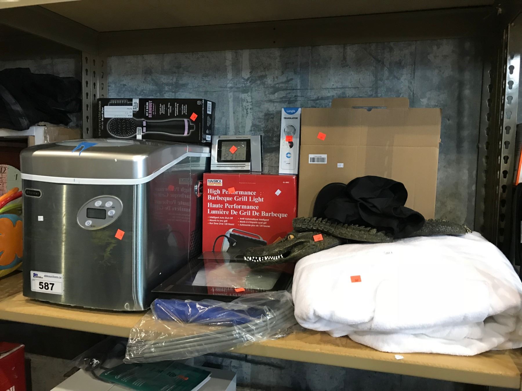 SHELF LOT OF ASSORTED ROBES, APPLIANCES & MORE