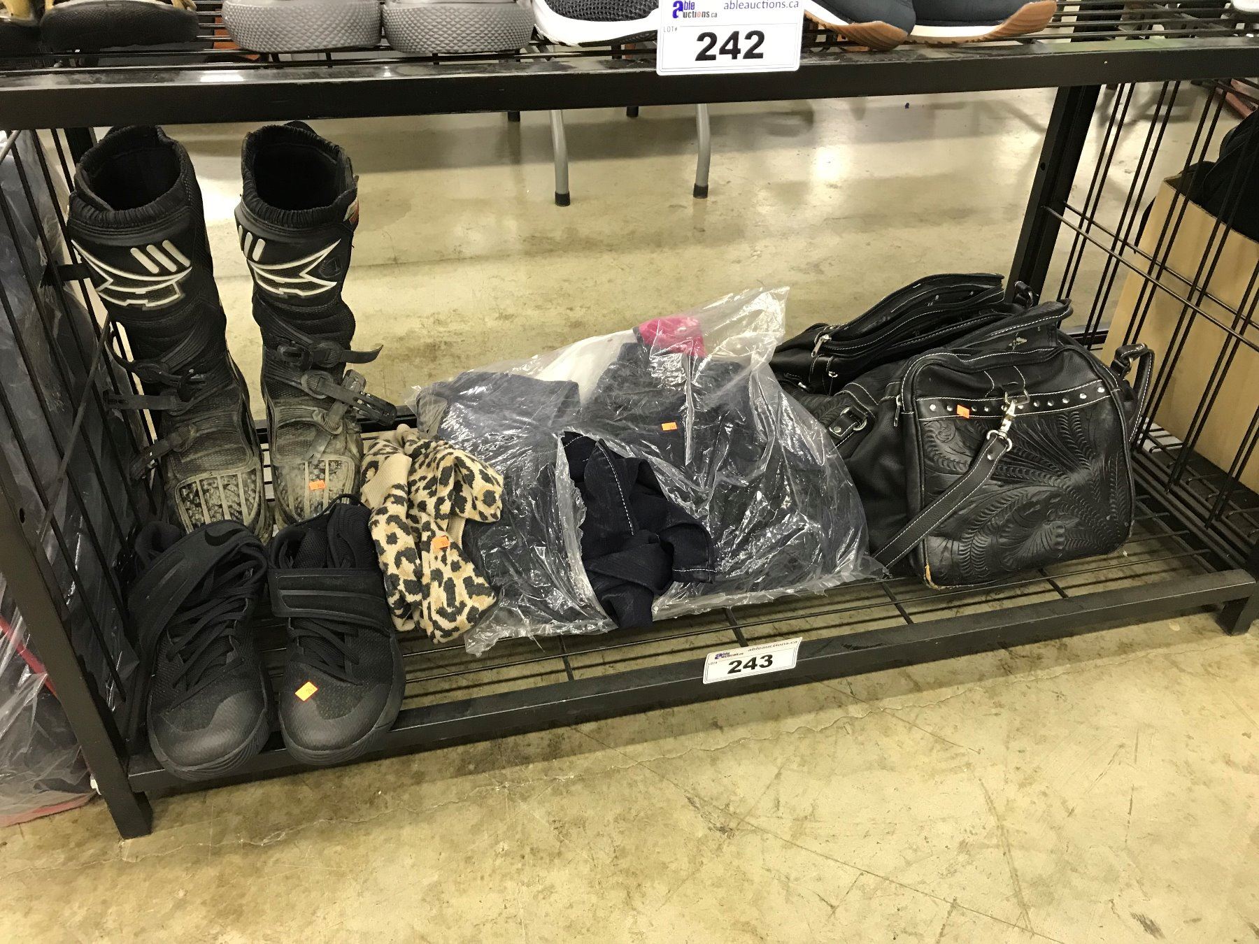 SHELF LOT OF ASSORTED SHOES, BAG & MOTORCYCLE BOOTS