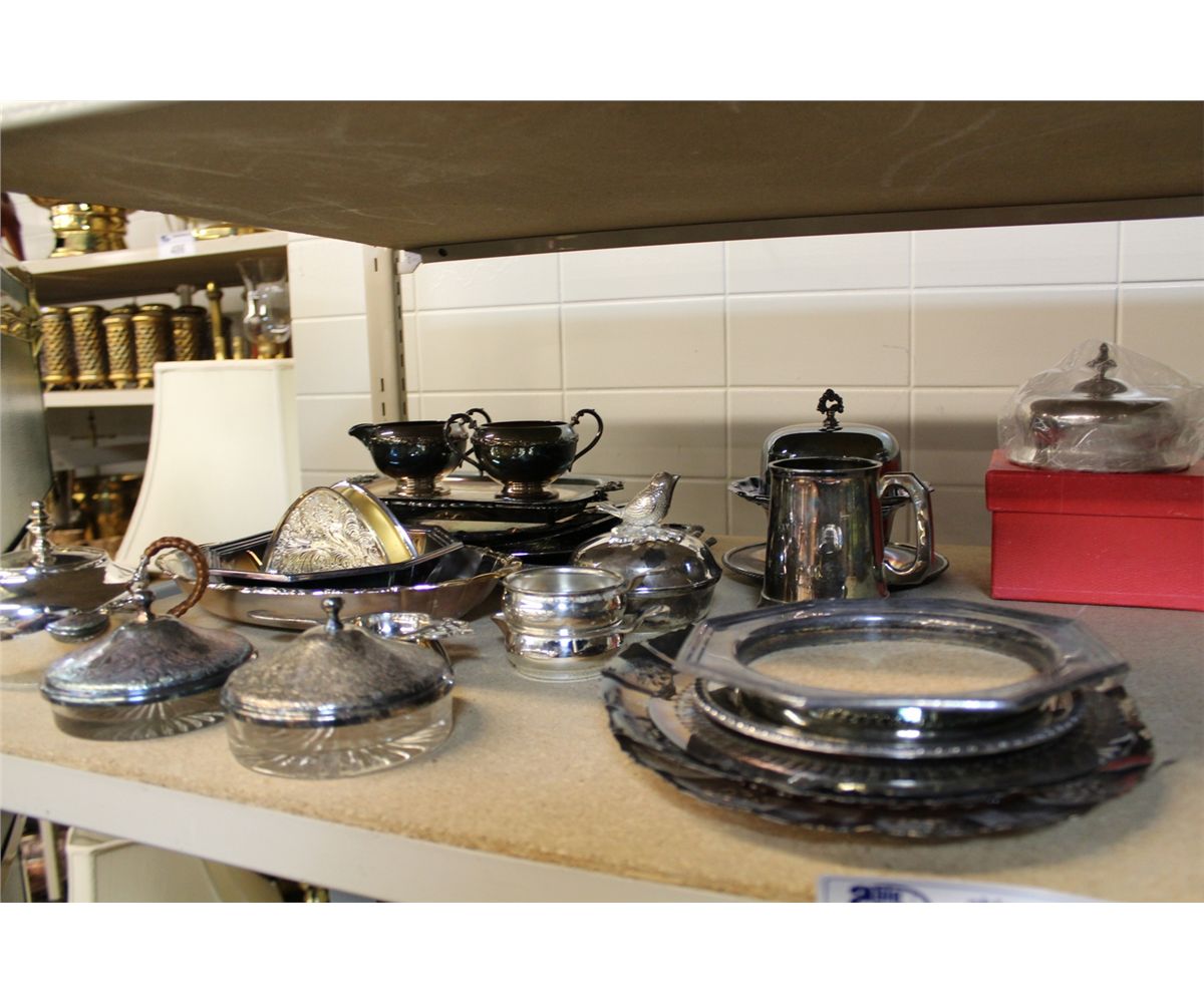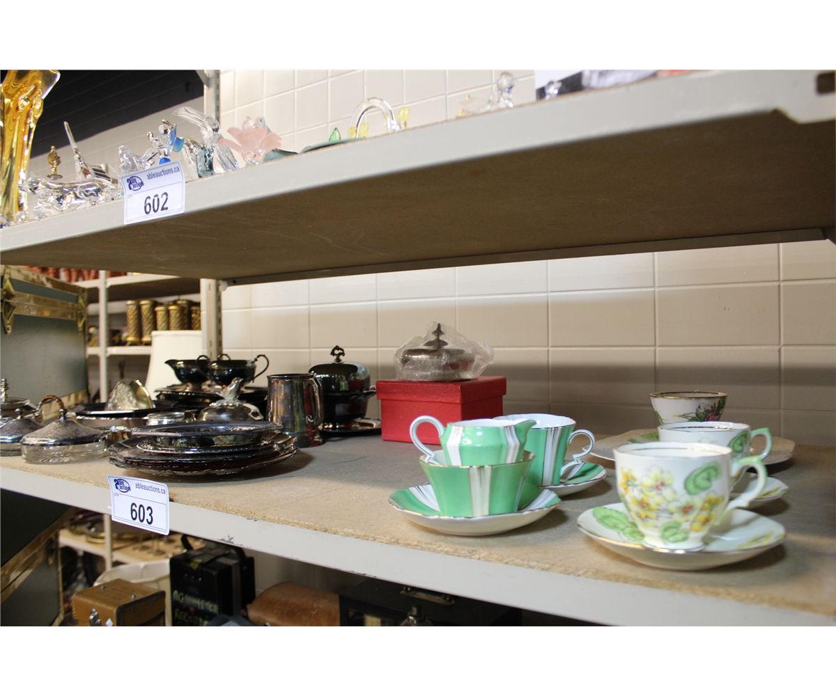 SHELF LOT OF ASSORTED SILVER PLATE, GALSSWARE AND TEA CUPS