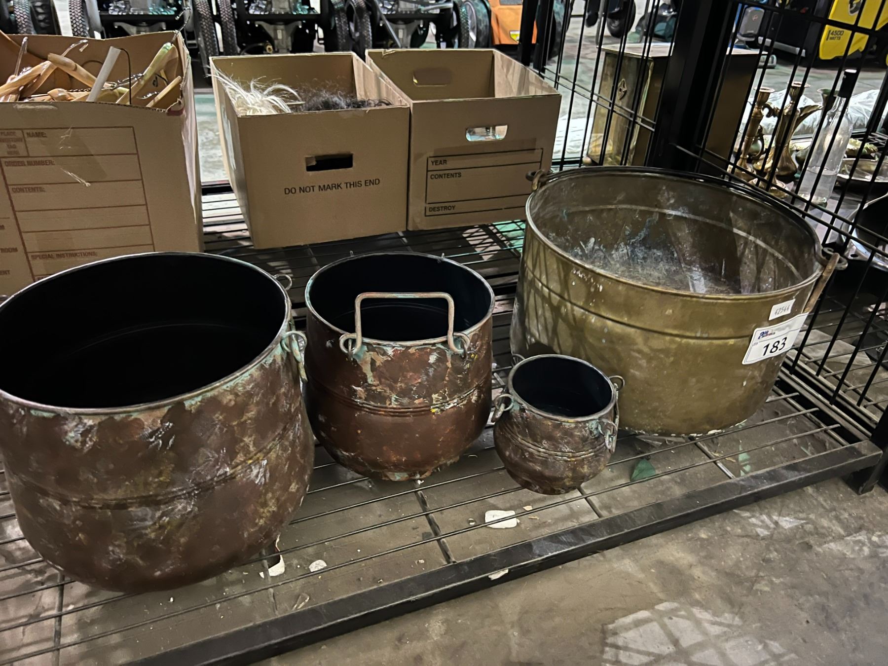 SHELF LOT OF ASSORTED SIZE COPPER POTS