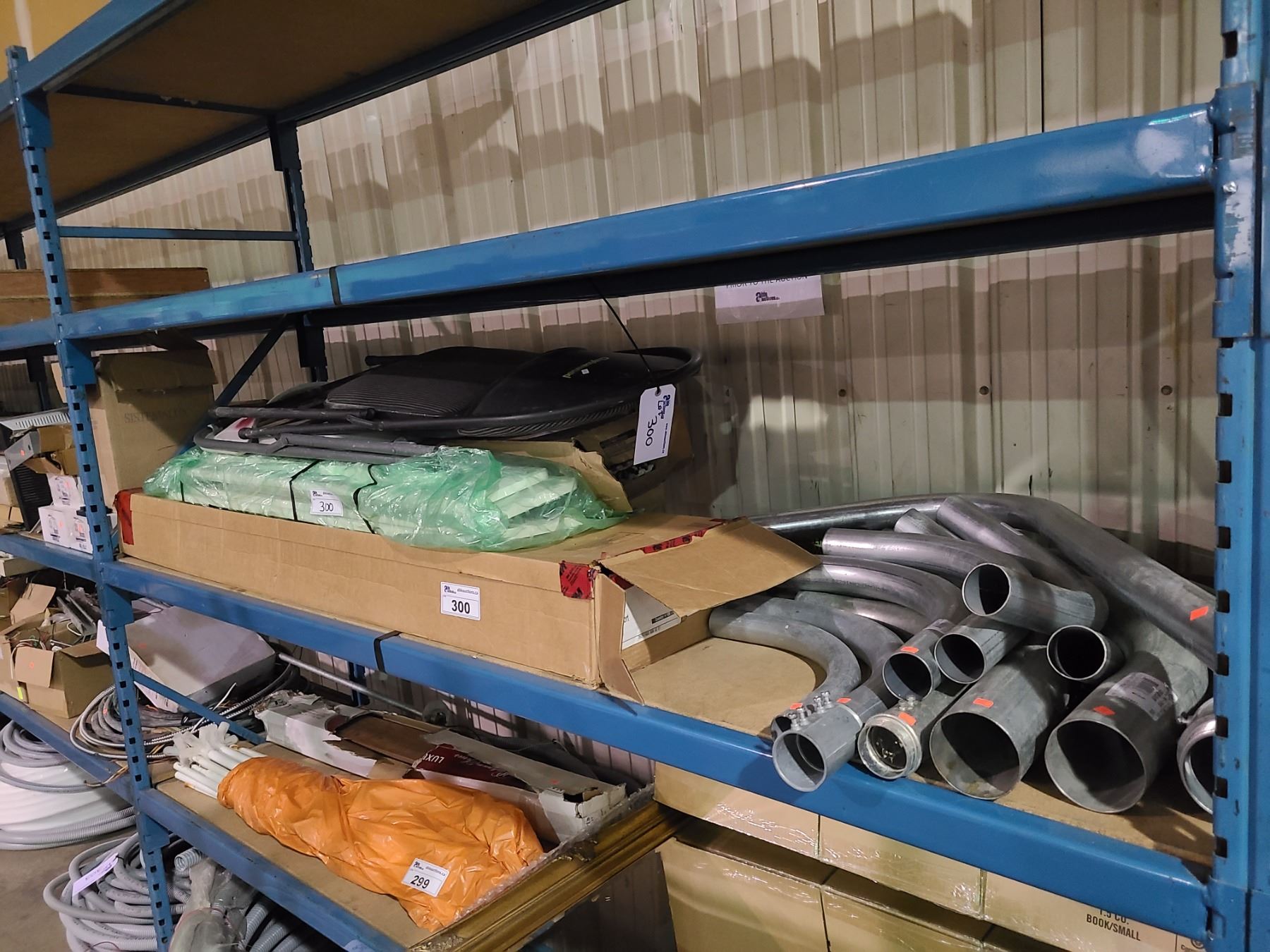 SHELF LOT OF ASSORTED SIZED EMT ELECTRICAL CONDUIT ELBOWS 90, TUBE LIGHTBULBS, LIGHT PANEL, LIGHT