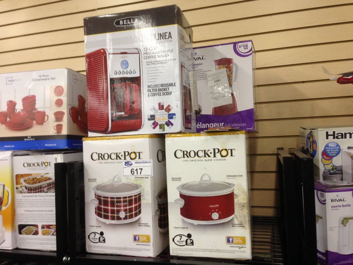 SHELF LOT OF ASSORTED SMALL APPLIANCES INCLUDING CROCKPOTS, BELLA COFFEE MAKER ETC.