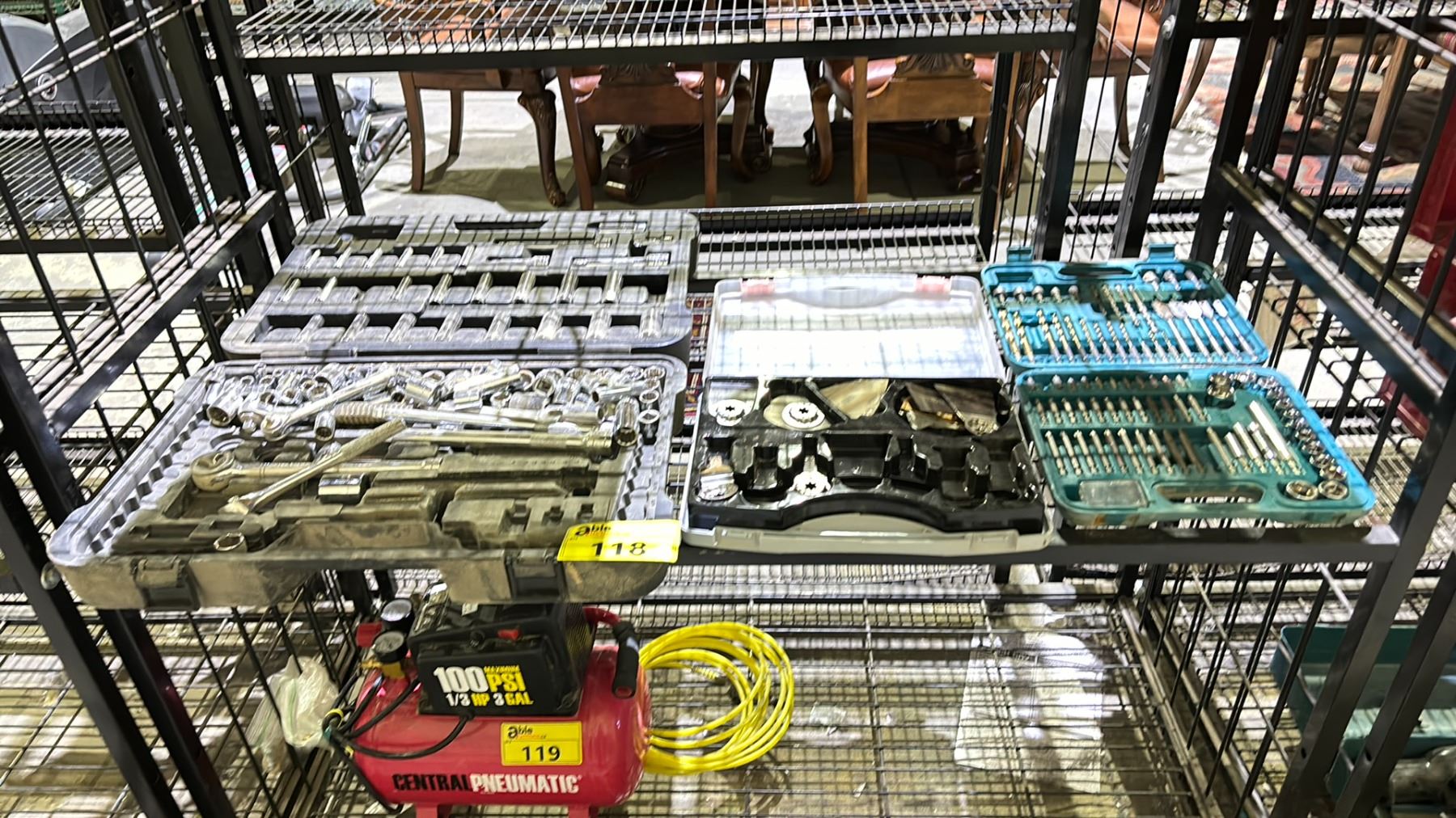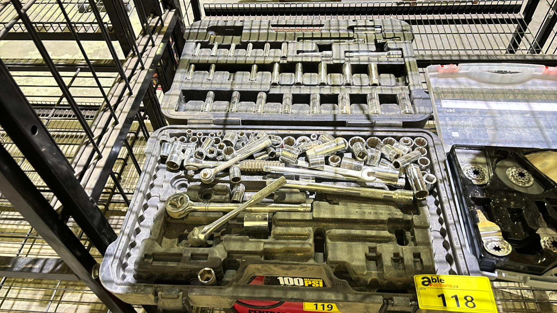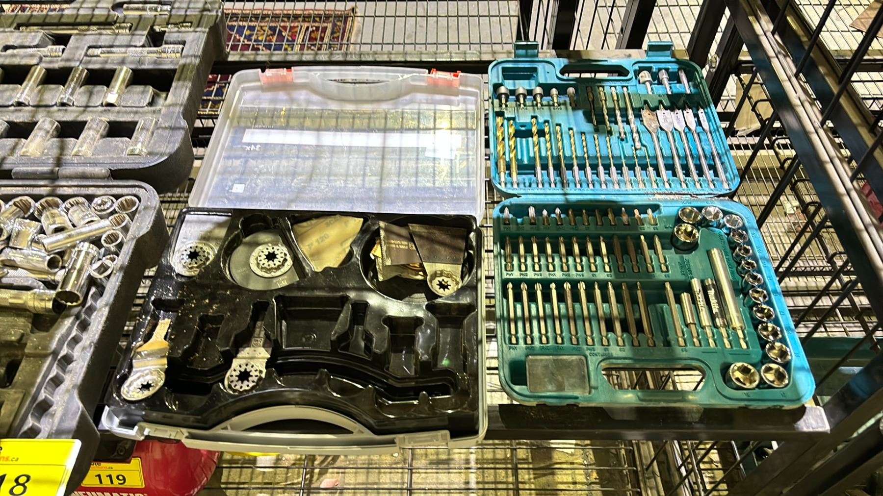 SHELF LOT OF ASSORTED SOCKET SETS, DRILL BITS AND MORE