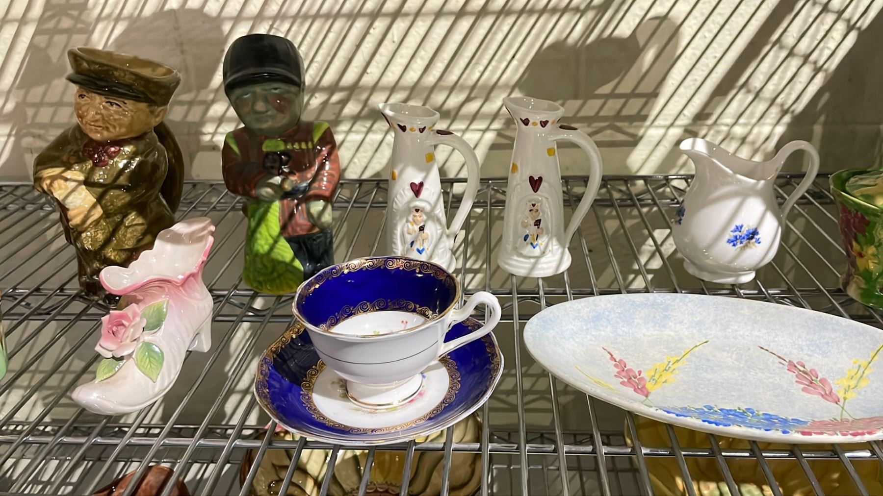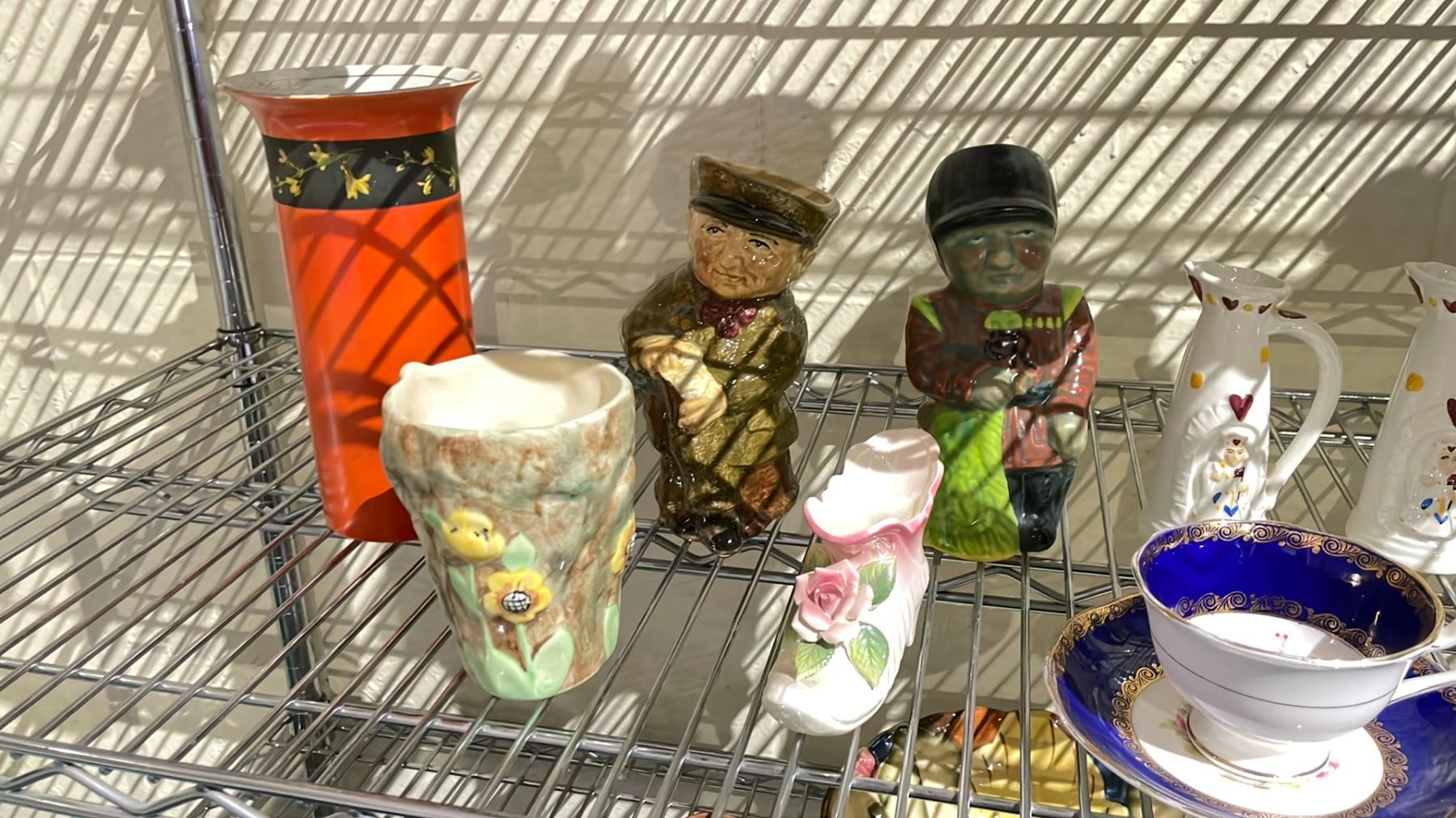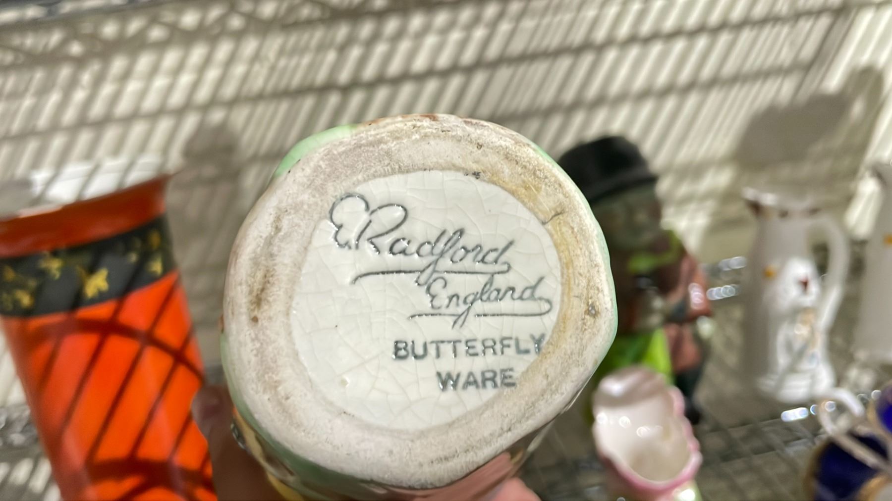 SHELF LOT OF ASSORTED STAFFORDSHIRE TOBY MUGS, RADFORD POTTERY AND MORE