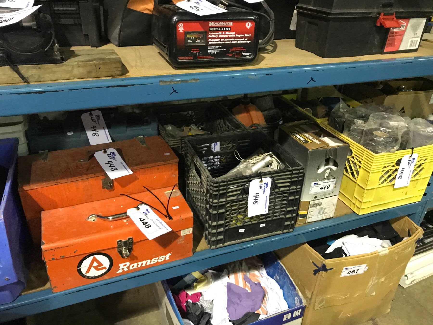 SHELF LOT OF ASSORTED TOOLBOXES & TOOLS & CAULKING AND HARDWARE