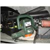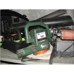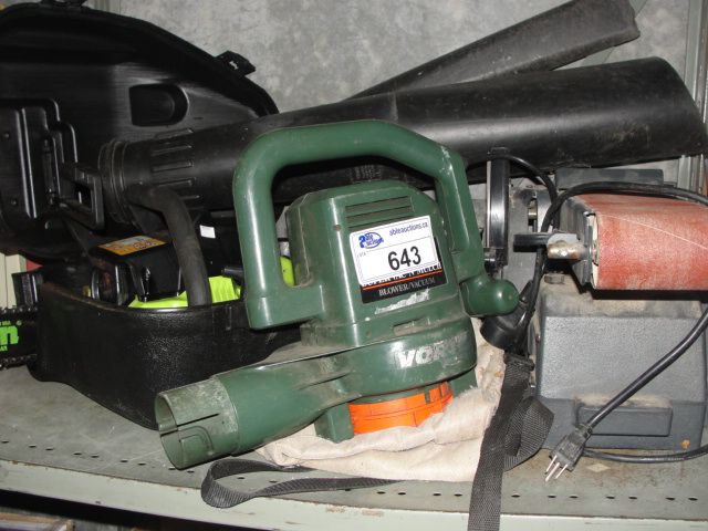SHELF LOT OF ASSORTED TOOLS; BENCH SANDER, BLOWER, POULAN CHAIN SAW