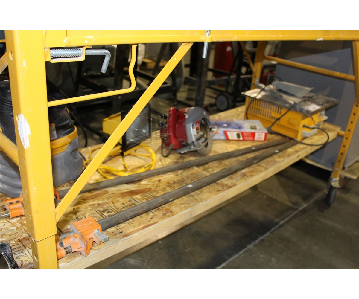 SHELF LOT OF ASSORTED TOOLS; CLAMPS, SAWS, WORK LIGHT ETC