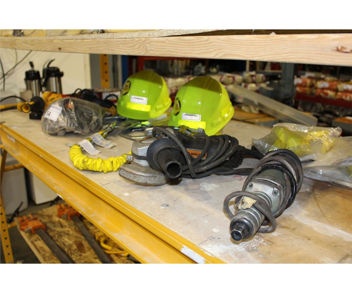 SHELF LOT OF ASSORTED TOOLS; DEWAULT GRINDERS, CONSTRUCTION HARD HATS, ETC
