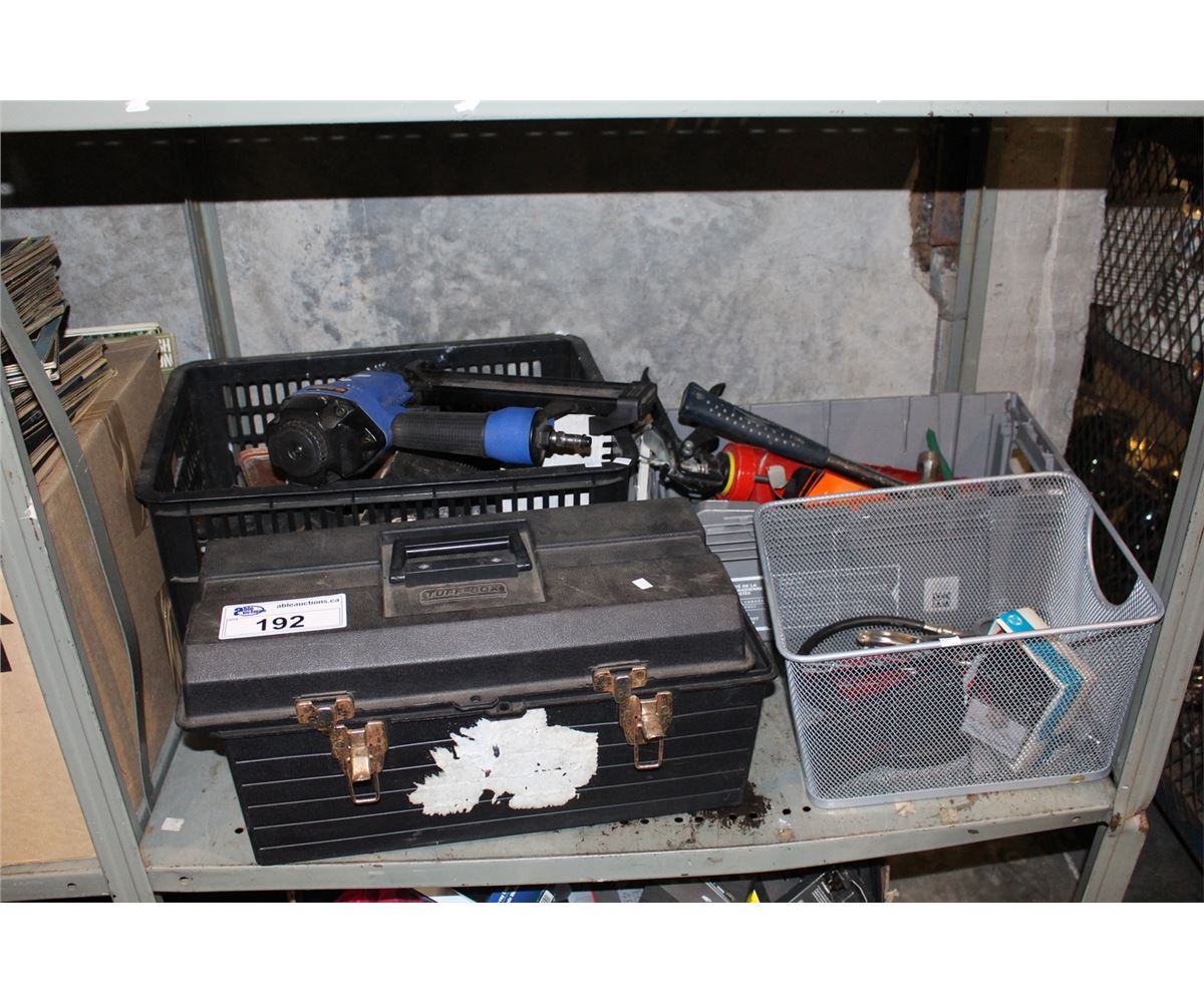 SHELF LOT OF ASSORTED TOOLS HARDWARE AND MISC