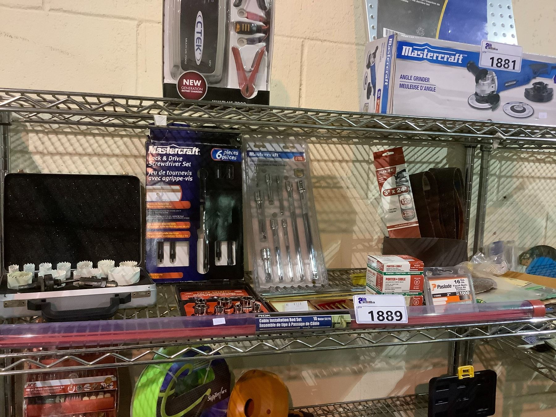 SHELF LOT OF ASSORTED TOOLS INCLUDING; MASTERCRAFT LOCK & DRIVE SCREWDRIVER SET, MASTERCRAFT WOBBLE EXTENSION BAR SET, HOLE SAW DRILL BITS & MORE