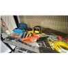 SHELF LOT OF ASSORTED TOOLS INCLUDING; REMINGTON LIMB N' TRIM 8 CHAINSAW, VICE, HAMMERS AND MORE