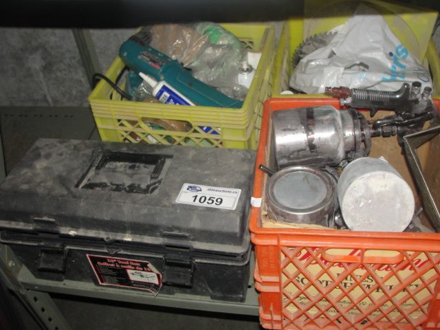SHELF LOT OF ASSORTED TOOLS; PAINT SPRAY CANS, BLACK TOOLBOX AND CONTENTS, MIKITA CORDLESS DRILL