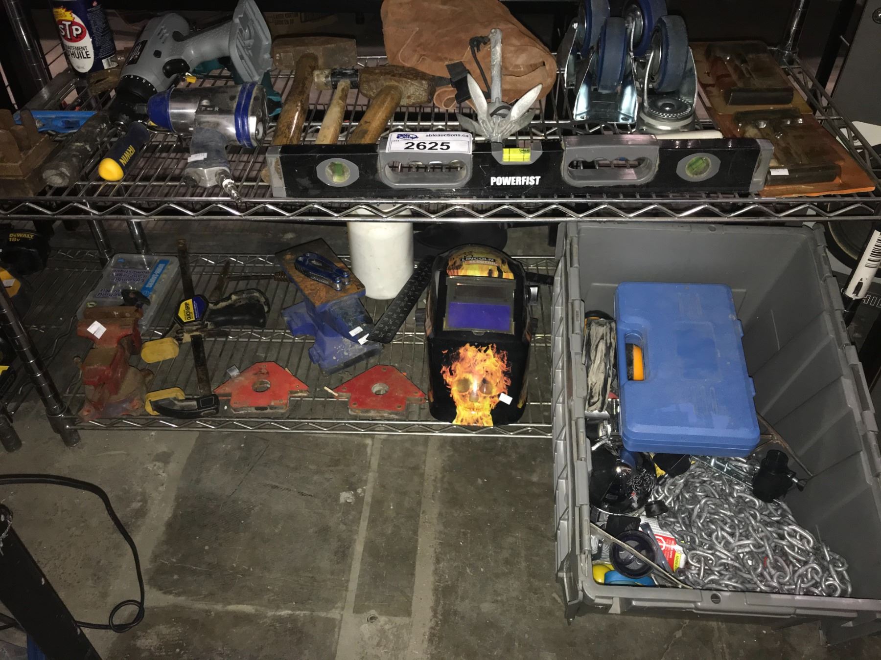 SHELF LOT OF ASSORTED TOOLS, VISE, AUTOSHADE WELDING HELMET, AND MORE