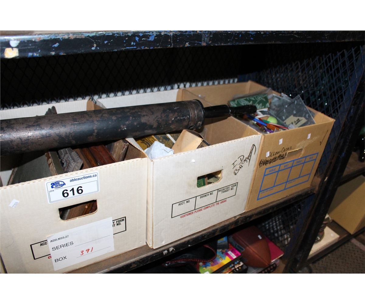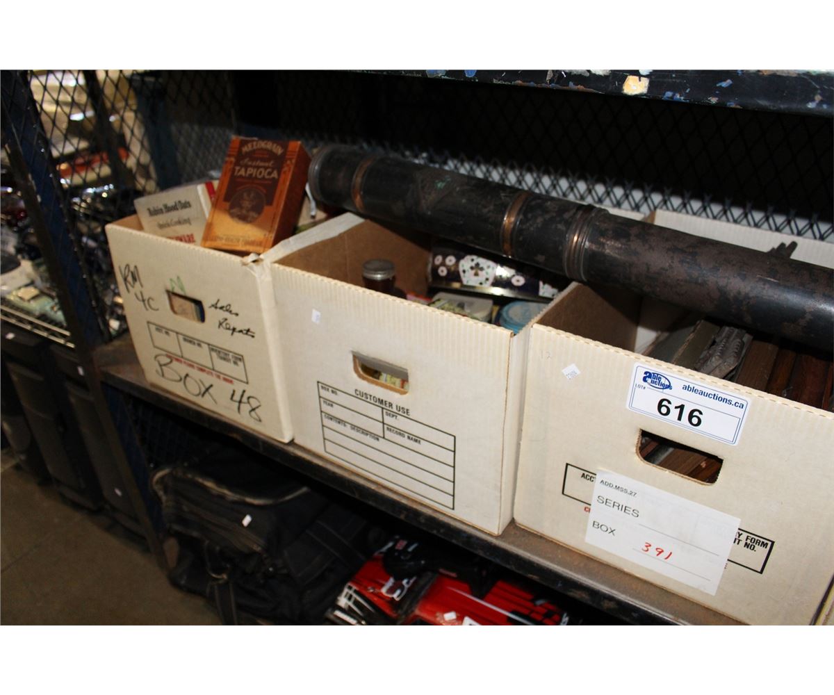 SHELF LOT OF ASSORTED VINTAGE COLLECTABLE ITEMS; TINS, PICTURES, ADVERTISEMENT BOXES, ETC