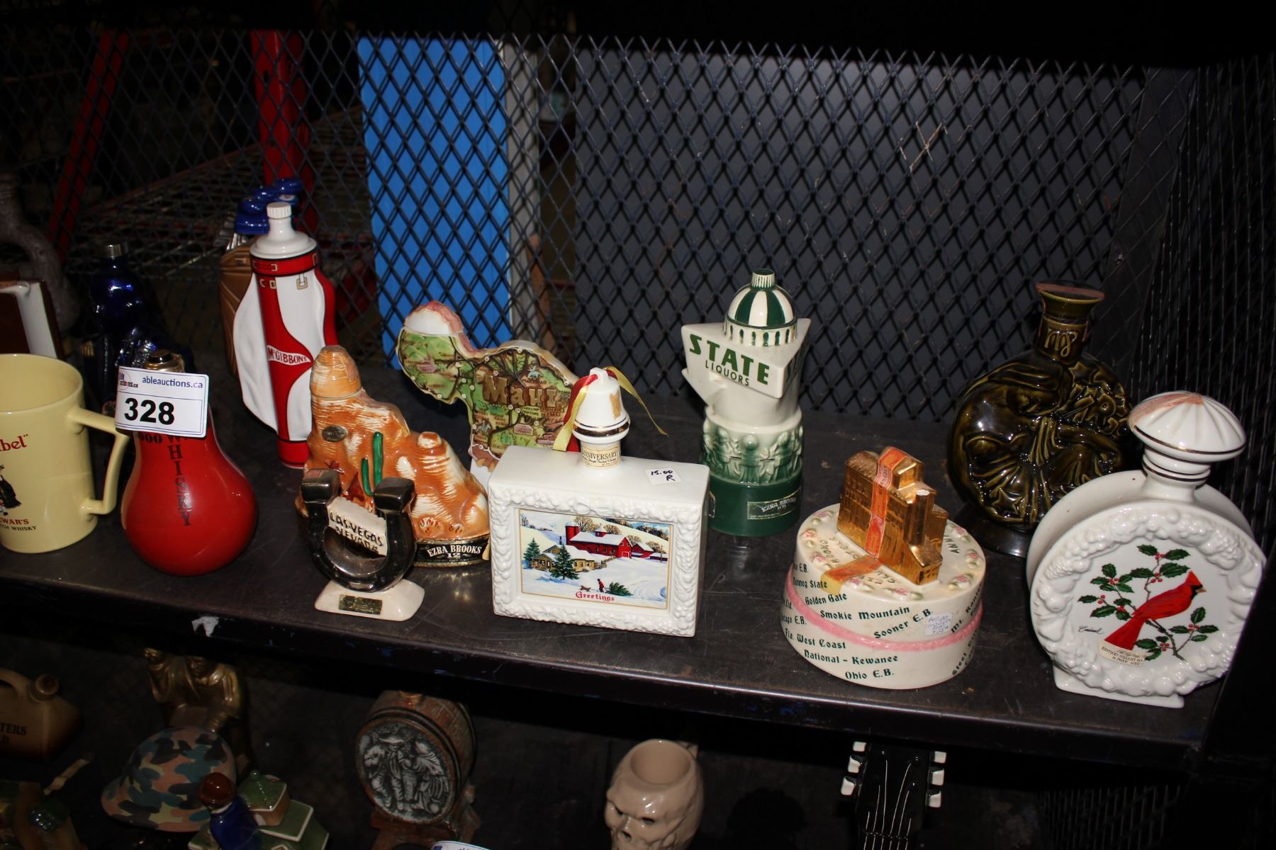 SHELF LOT OF ASSORTED VINTAGE LIQUOR BOTTLES AND MORE