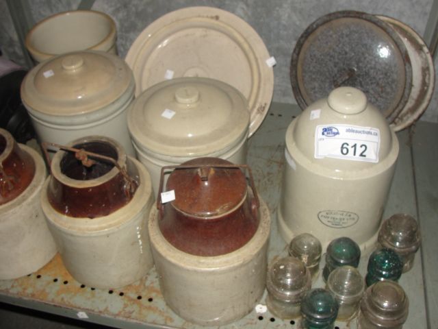 SHELF LOT OF ASSORTED VINTAGE STONEWARE CROCKS AND VINTAGE BRASS PHONELINE INSULATORS