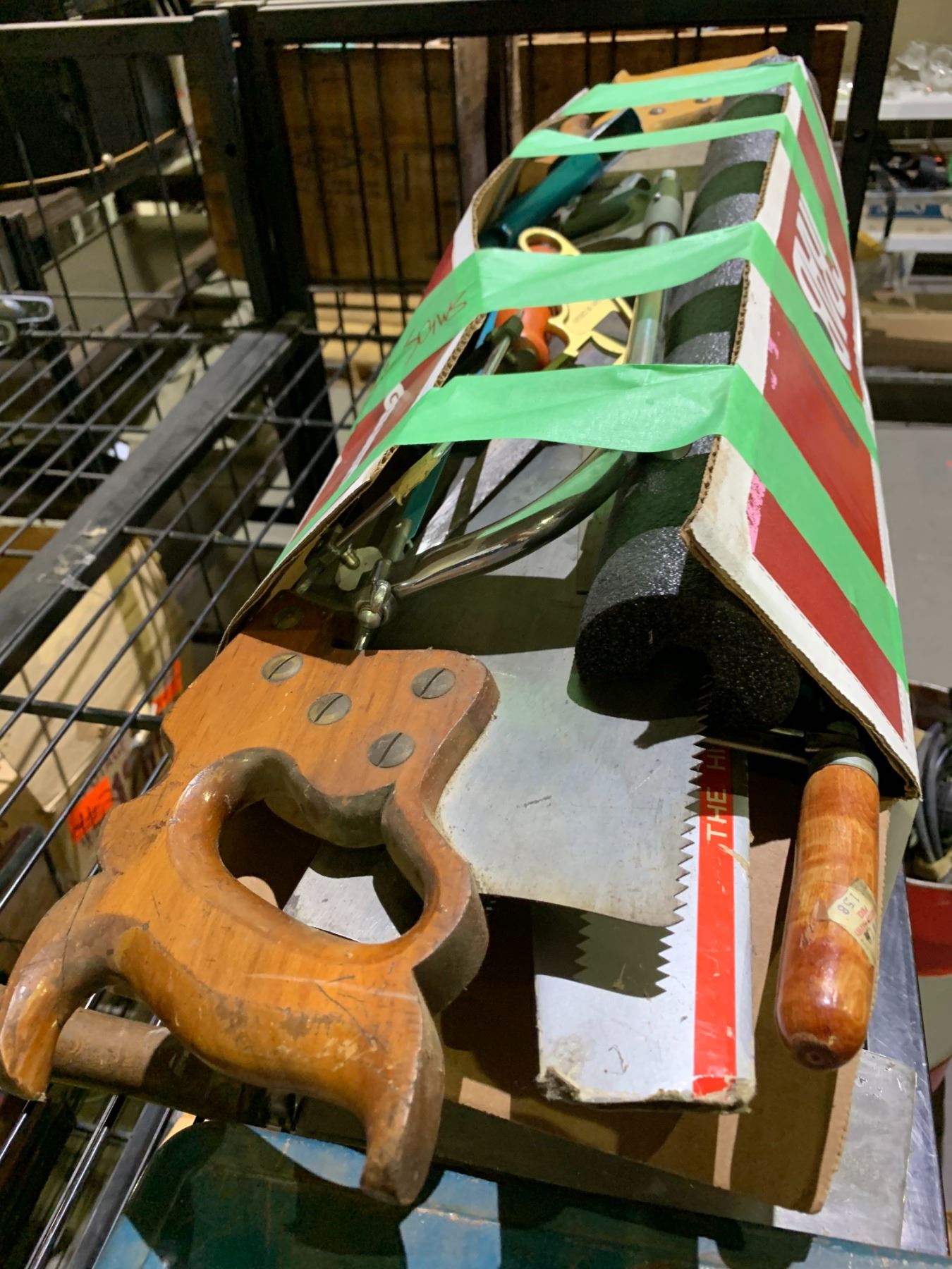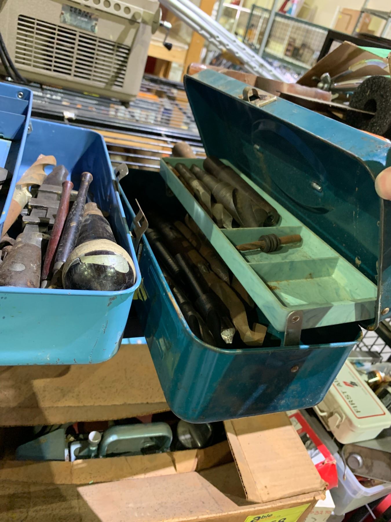 SHELF LOT OF ASSORTED VINTAGE TOOLS; DRILL BITS, SAWS AND MORE