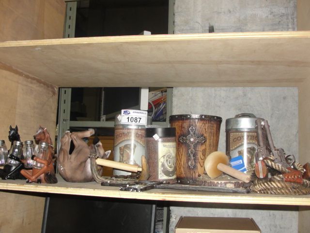 SHELF LOT OF ASSORTED WESTERN MOTIF DECORATIVE PIECES
