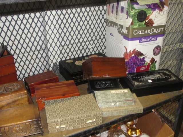 SHELF LOT OF ASSORTED WOODEN KEEPSAKE BOXES, AND MISC COLLECTABLES