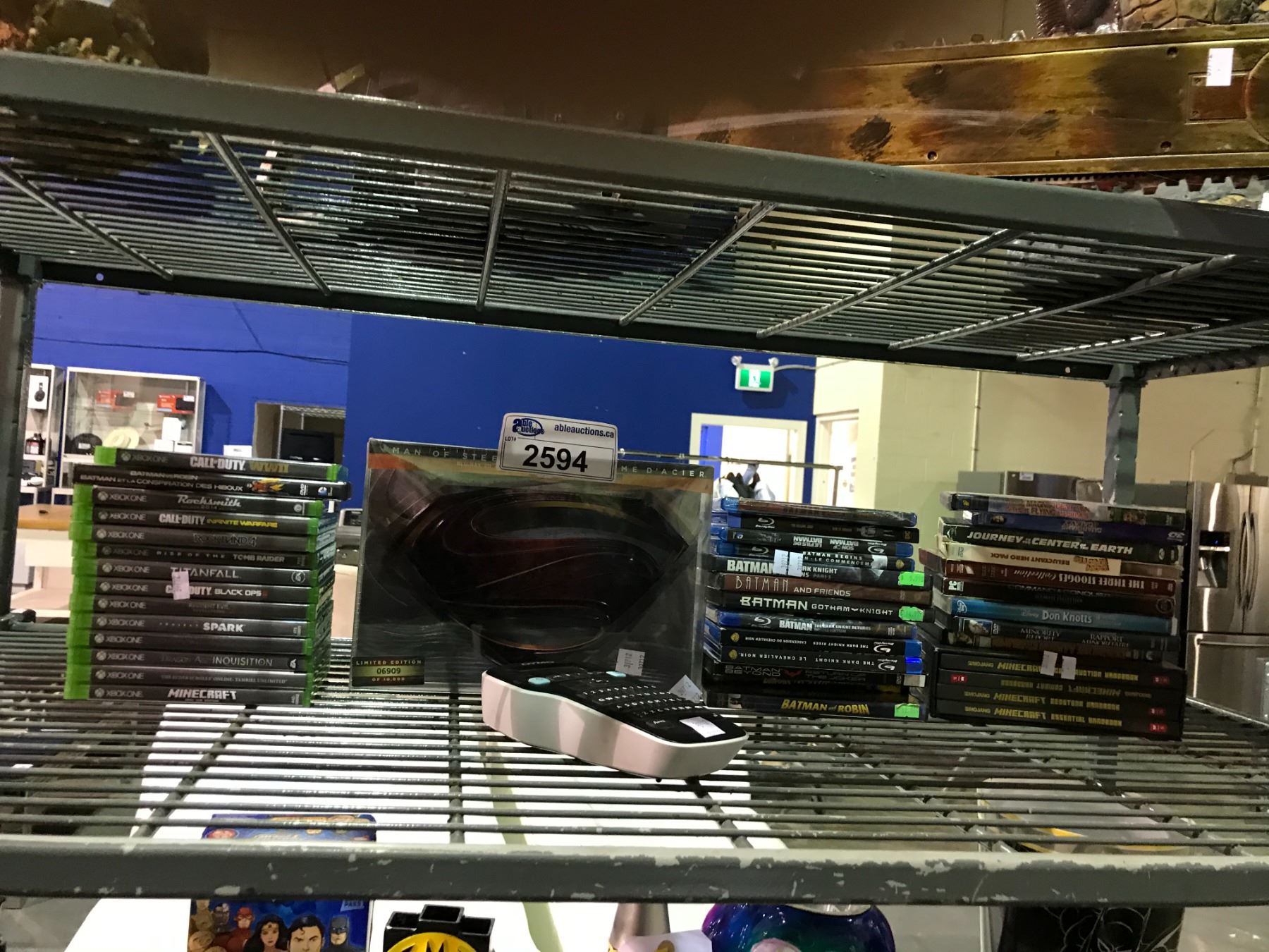 SHELF LOT OF ASSORTED XBOX ONE GAMES ASSORTED DVD'S AND BLUE RAY MOVIES