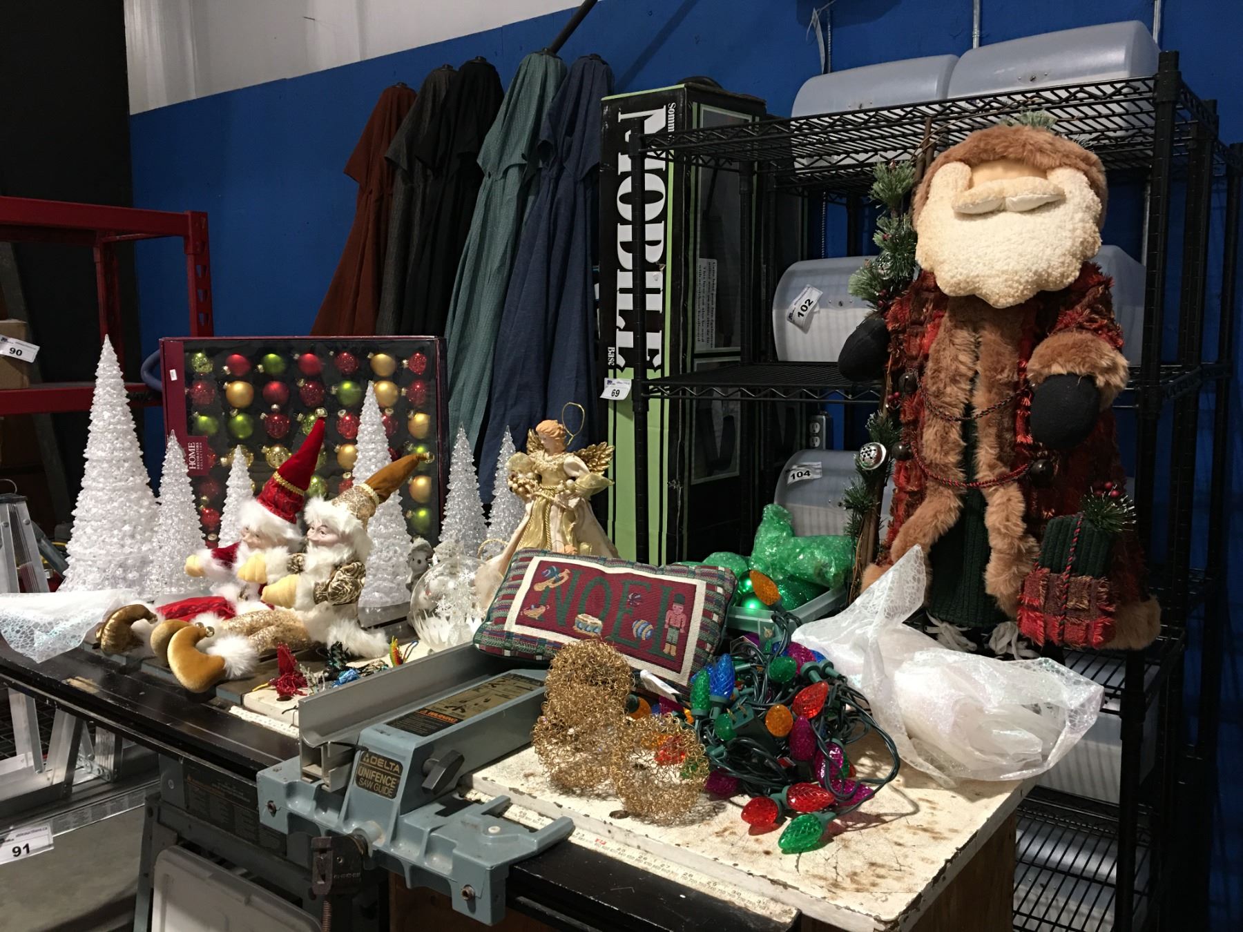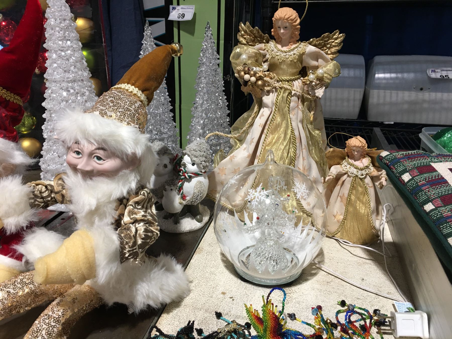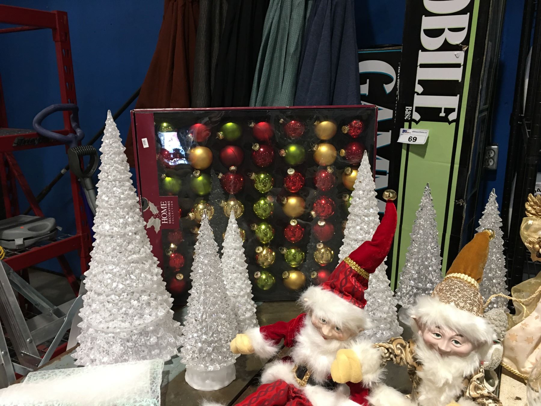 SHELF LOT OF ASSTD CHRISTMAS DECORATIONS (LIGHTS/DECORATIONS/STANDING ST. NICK, LIT GLASS ORNAMENT, AND ASSORTED SEASONAL ITEMS
