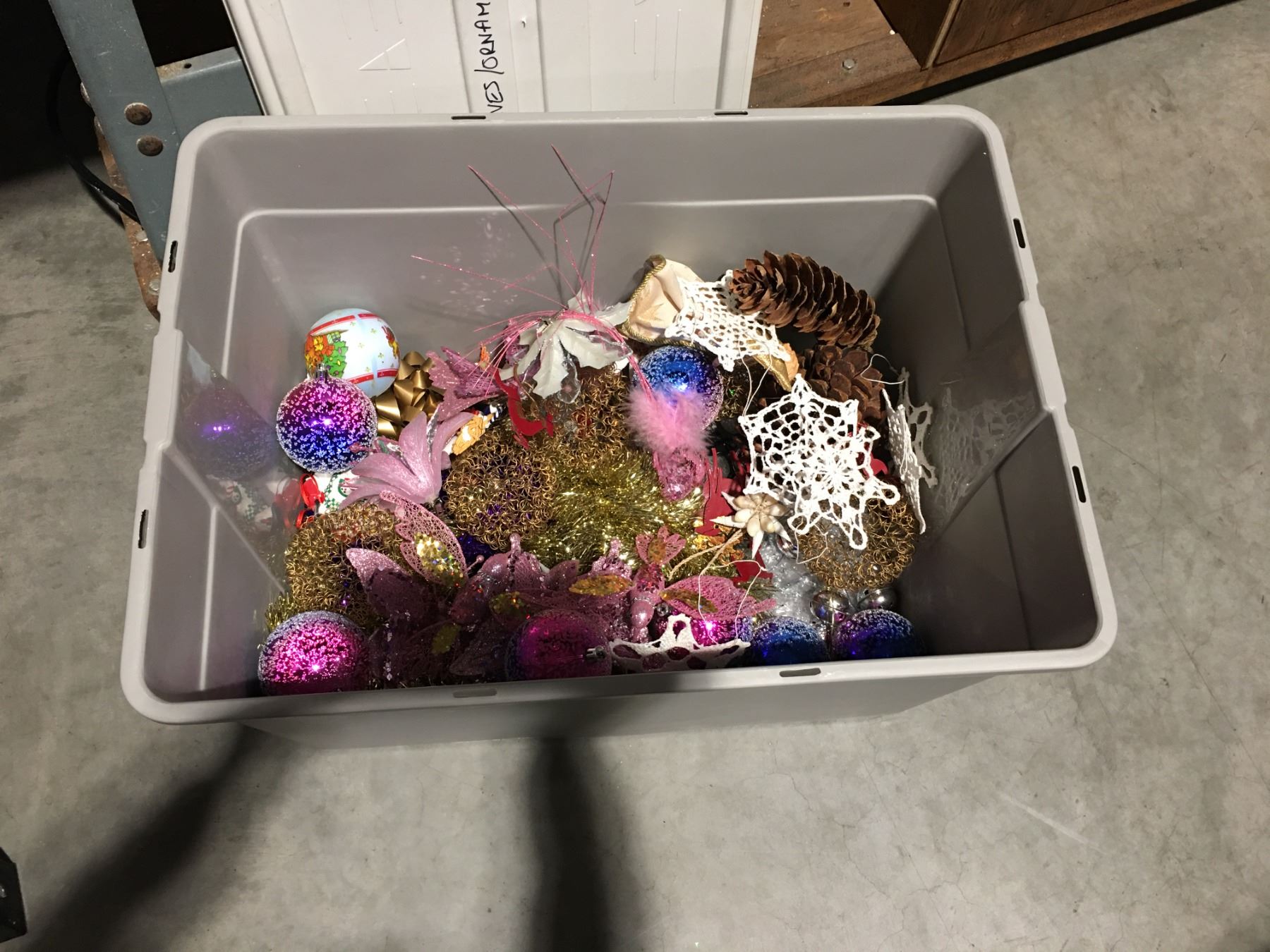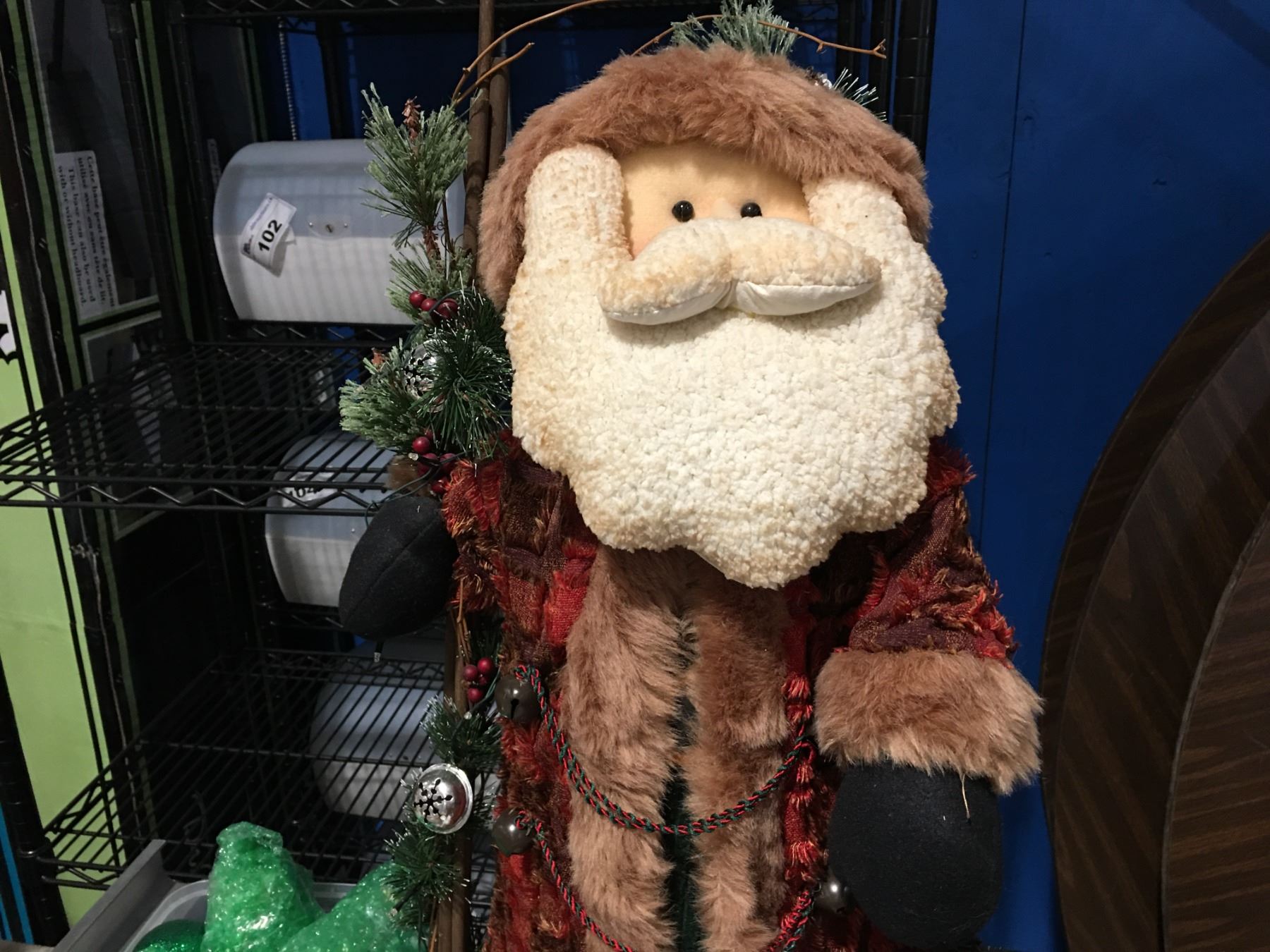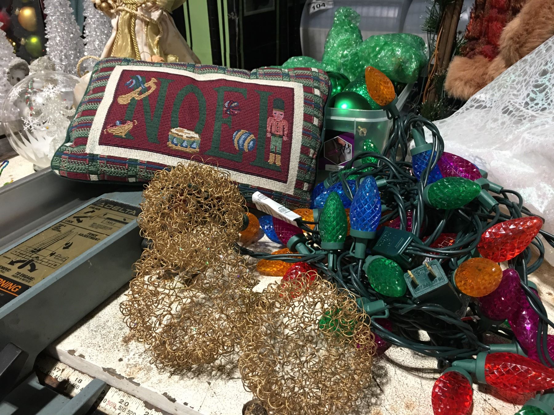 SHELF LOT OF ASSTD CHRISTMAS DECORATIONS (LIGHTS/DECORATIONS/STANDING ST. NICK, LIT GLASS ORNAMENT, AND ASSORTED SEASONAL ITEMS
