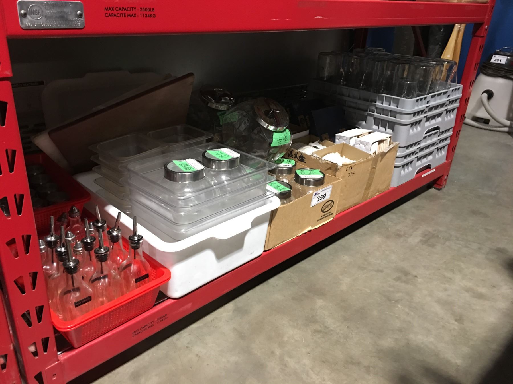 SHELF LOT OF ASSTD COMMERCIAL RESTAURANT SERVING PCS, CONTAINERS, GLASS WARE ETC