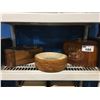 SHELF LOT OF ASSTD DECORATIVE WOODEN BOWLS, VASES & COLLECTORS TINS