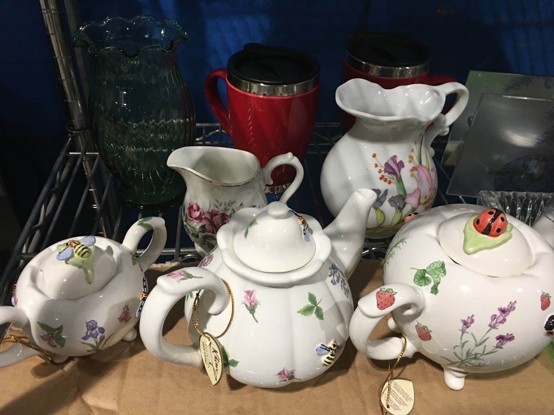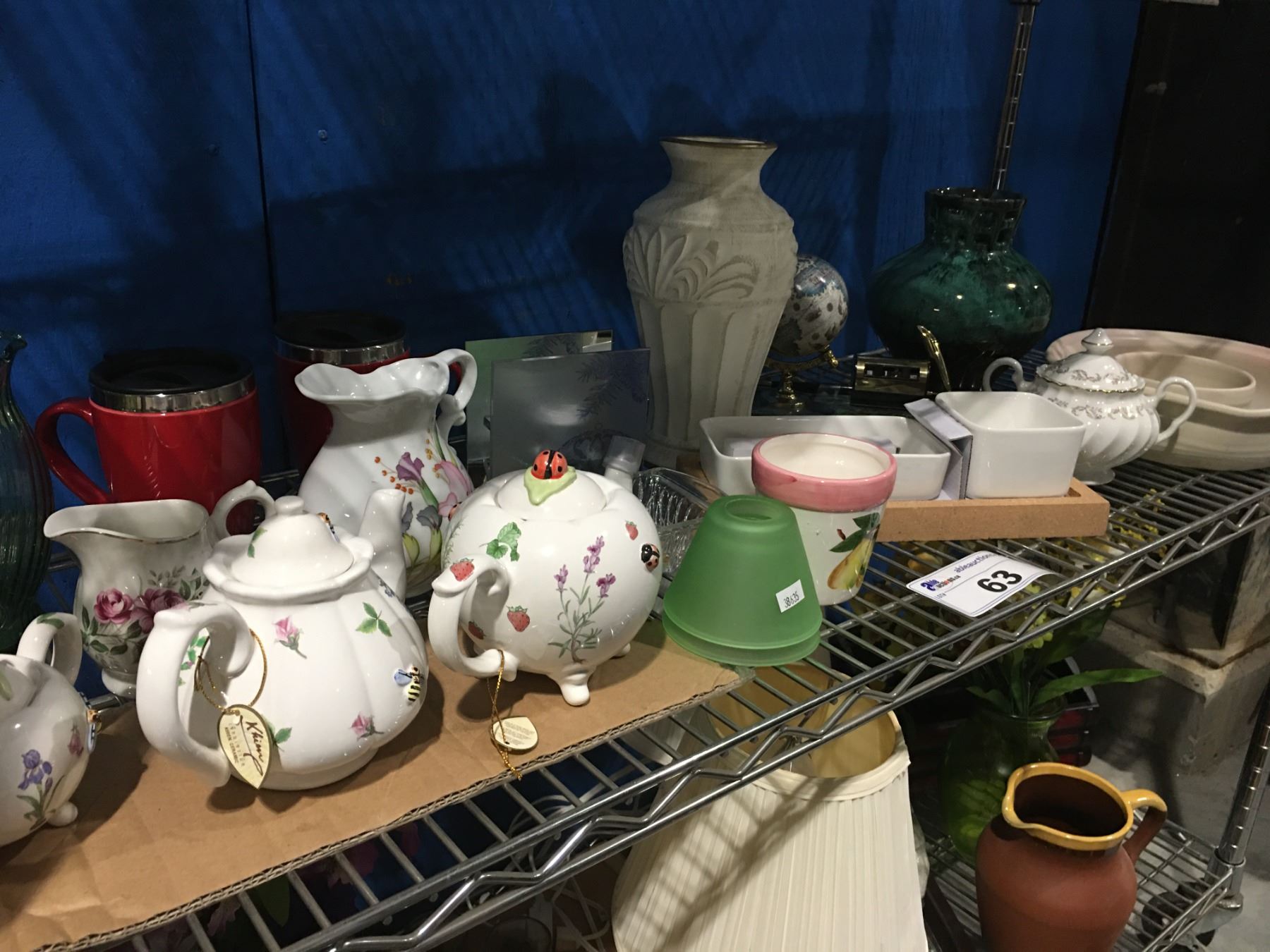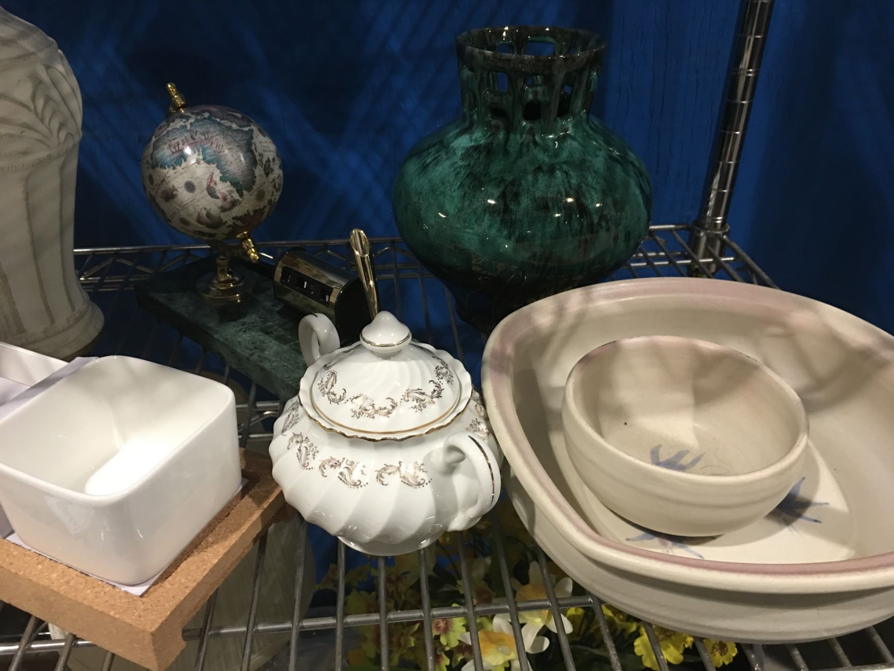 SHELF LOT OF ASSTD GLASS WARE (TEAPOTS/VASES/POTTERY BOWLS ETC)