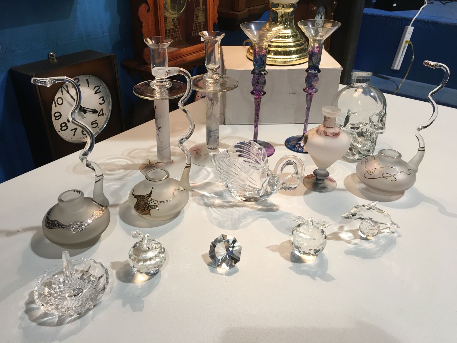 SHELF LOT OF ASSTD GLASSWARE - CANDLE HOLDERS/RING HOLDER/CRYSTAL FIGURINES/ SINGLE ROSE BUD VASE ETC.