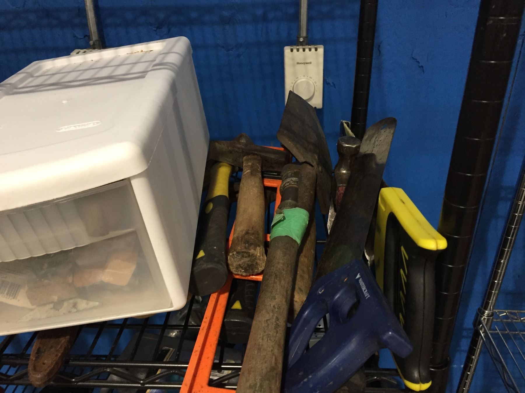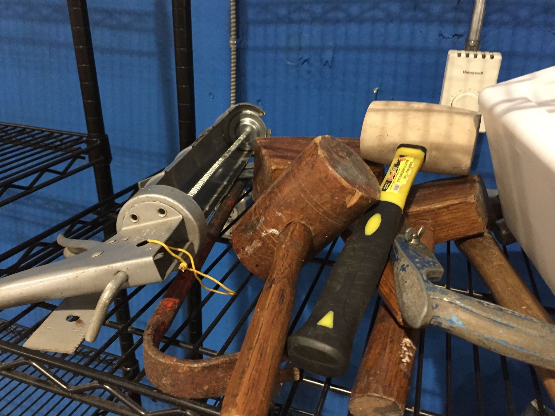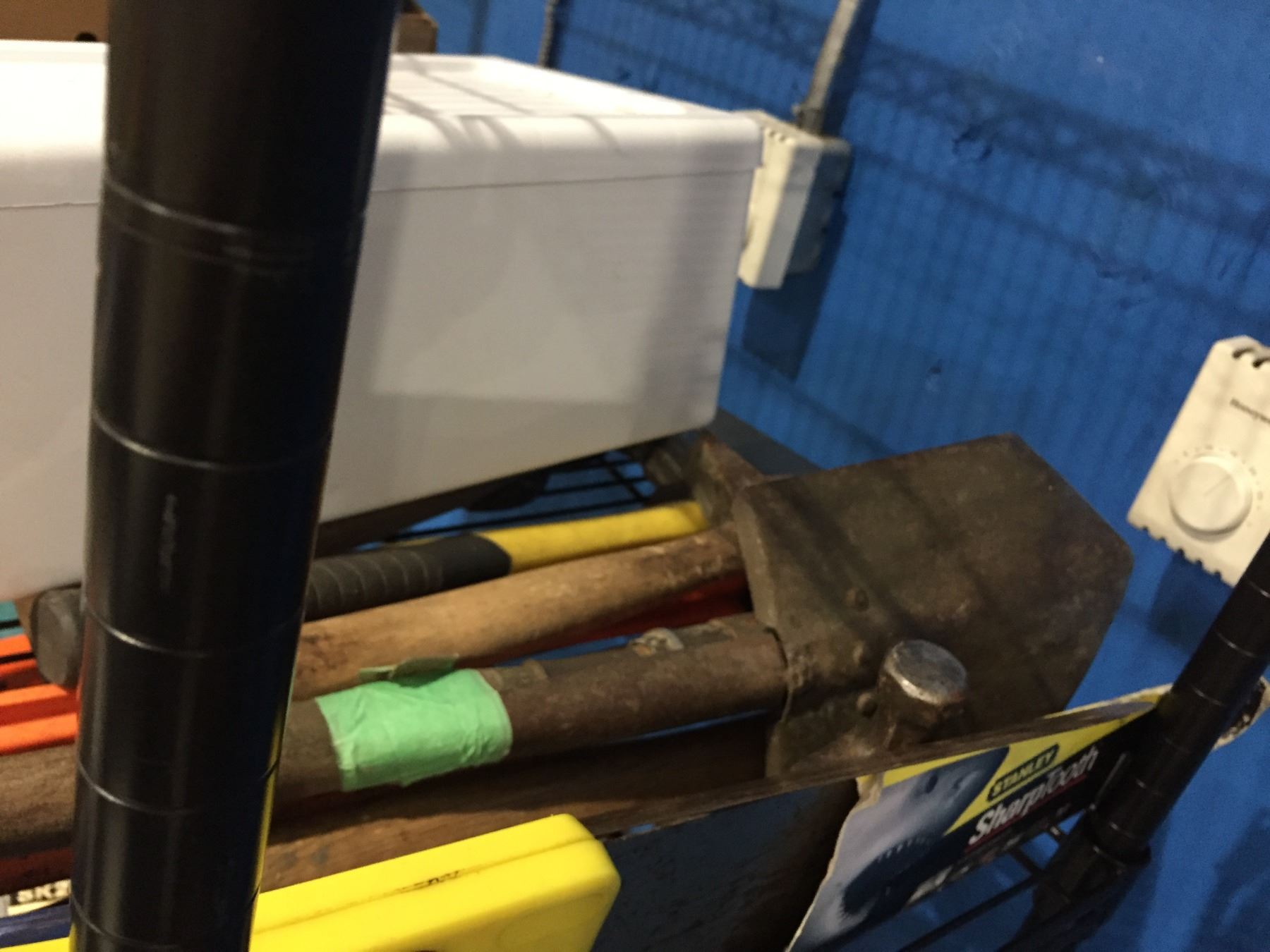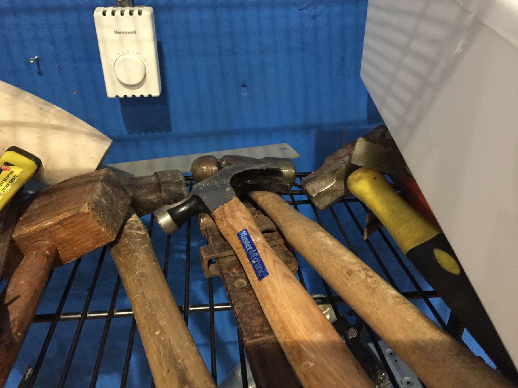 SHELF LOT OF ASSTD HAND TOOLS - HAMMERS/SAW/LEVEL & MISC STEEL BRUSHES