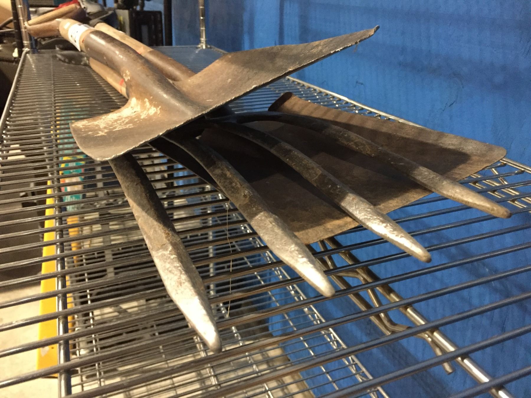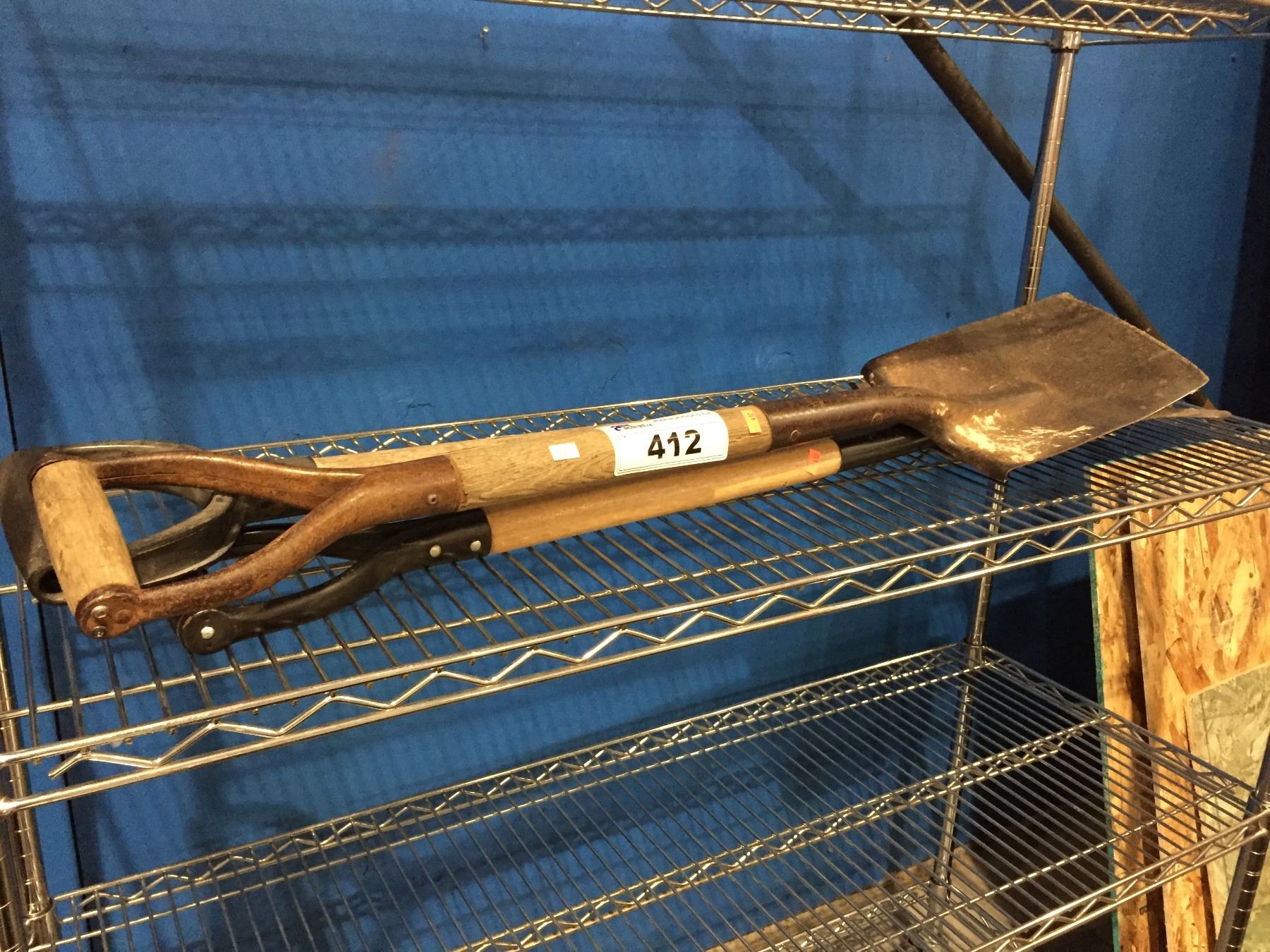 SHELF LOT OF ASSTD SHOVELS & PITCHFORK
