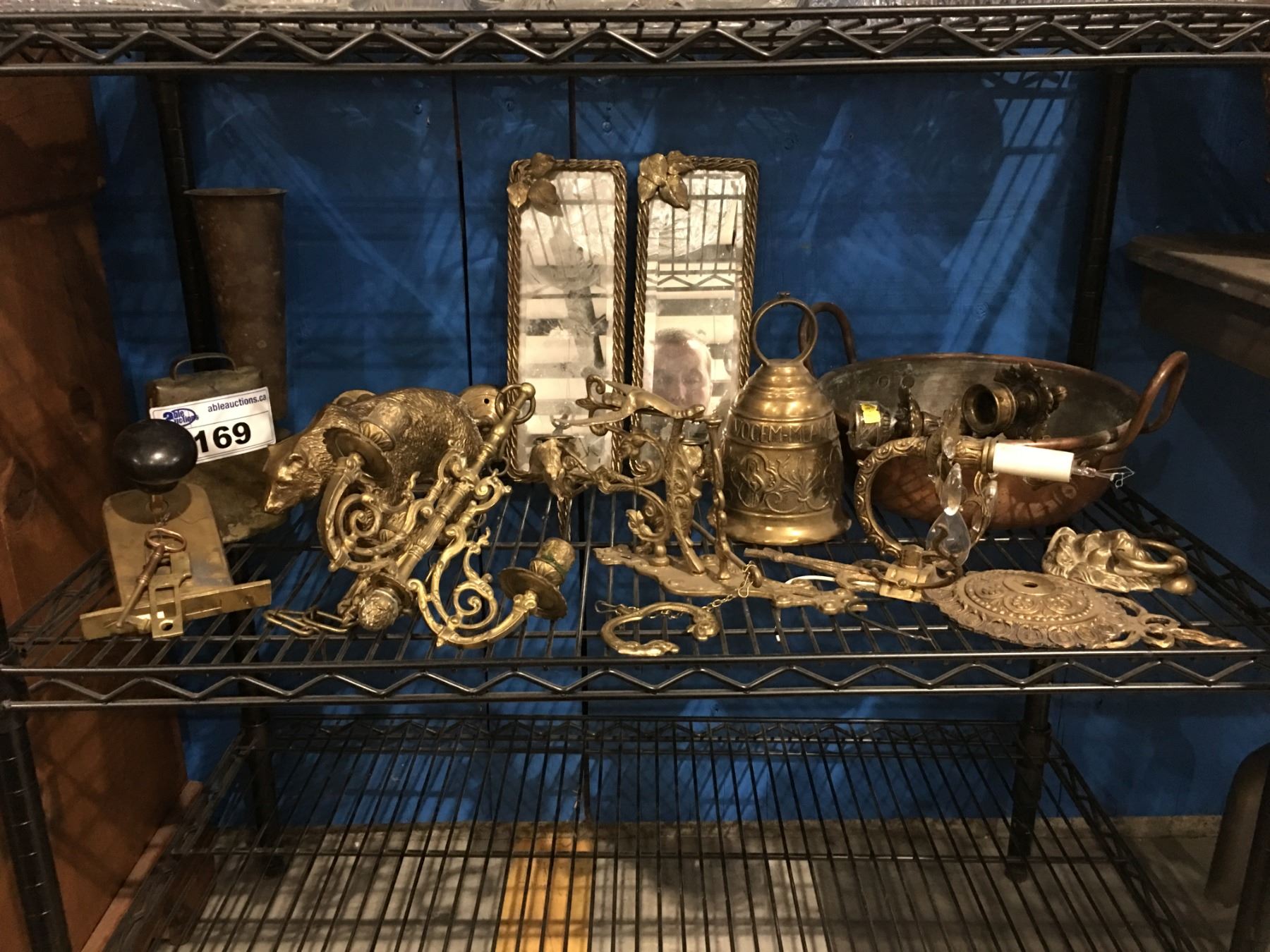 SHELF LOT OF ASSTD VINTAGE BRASS WARES
