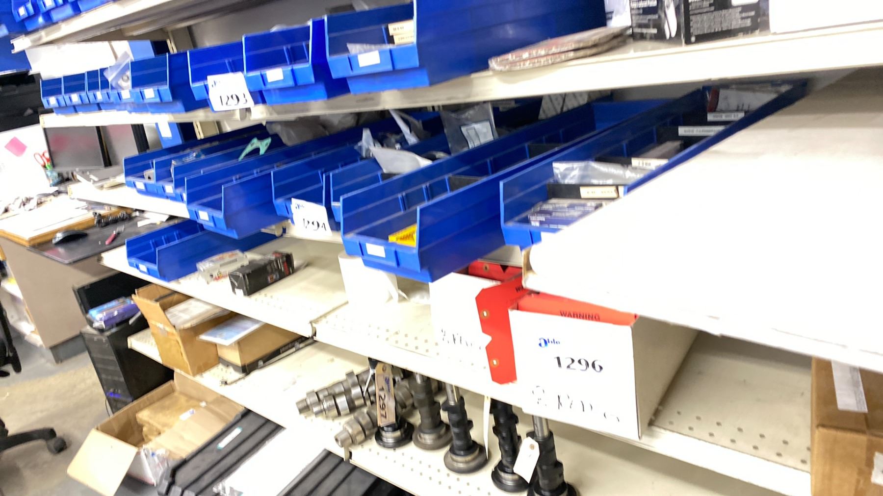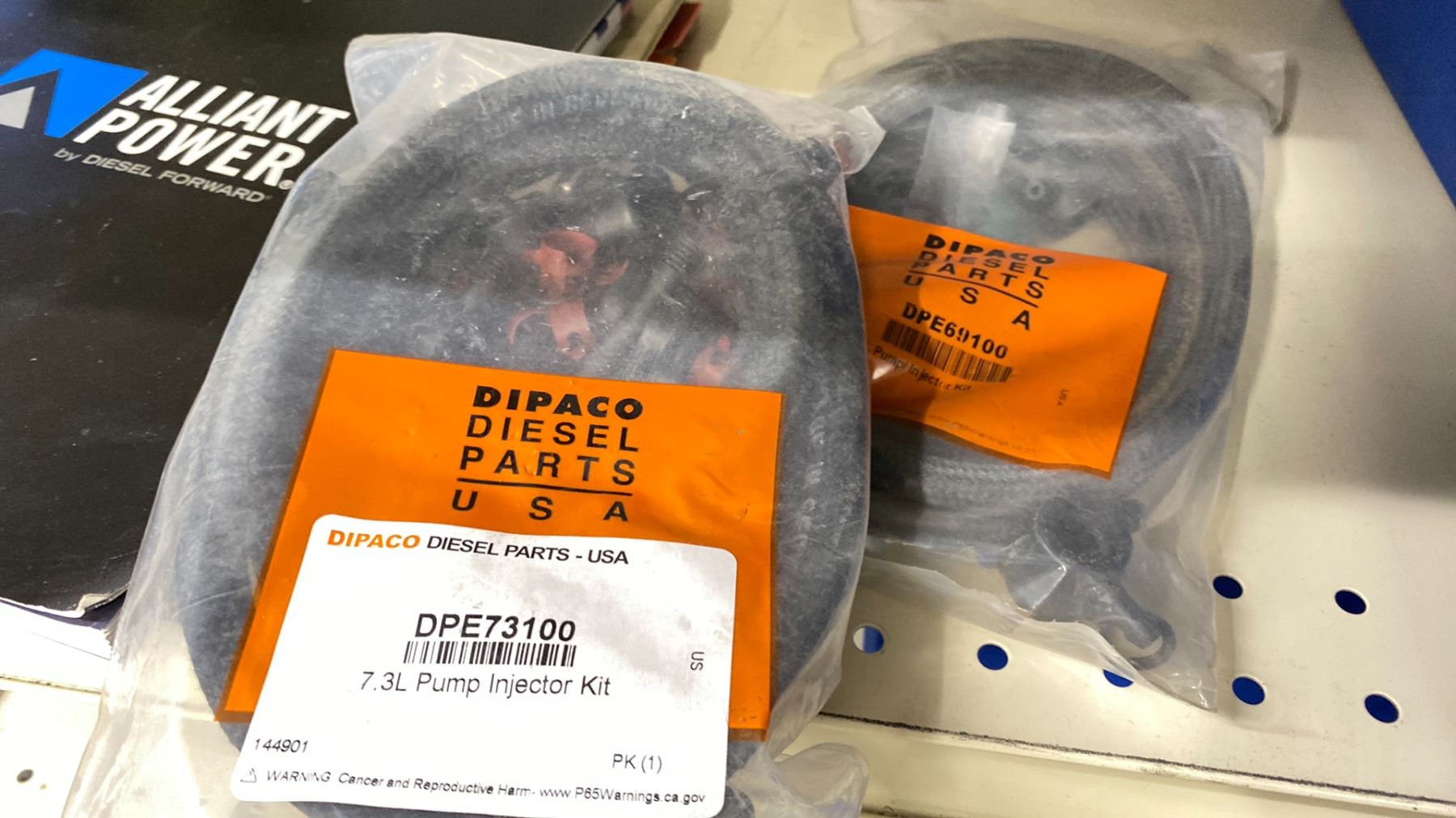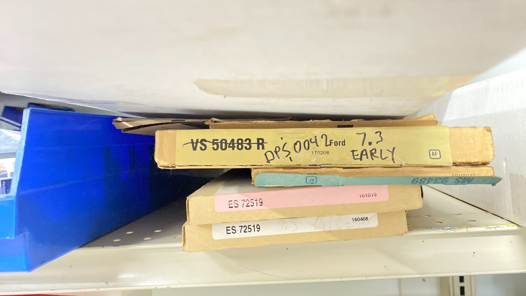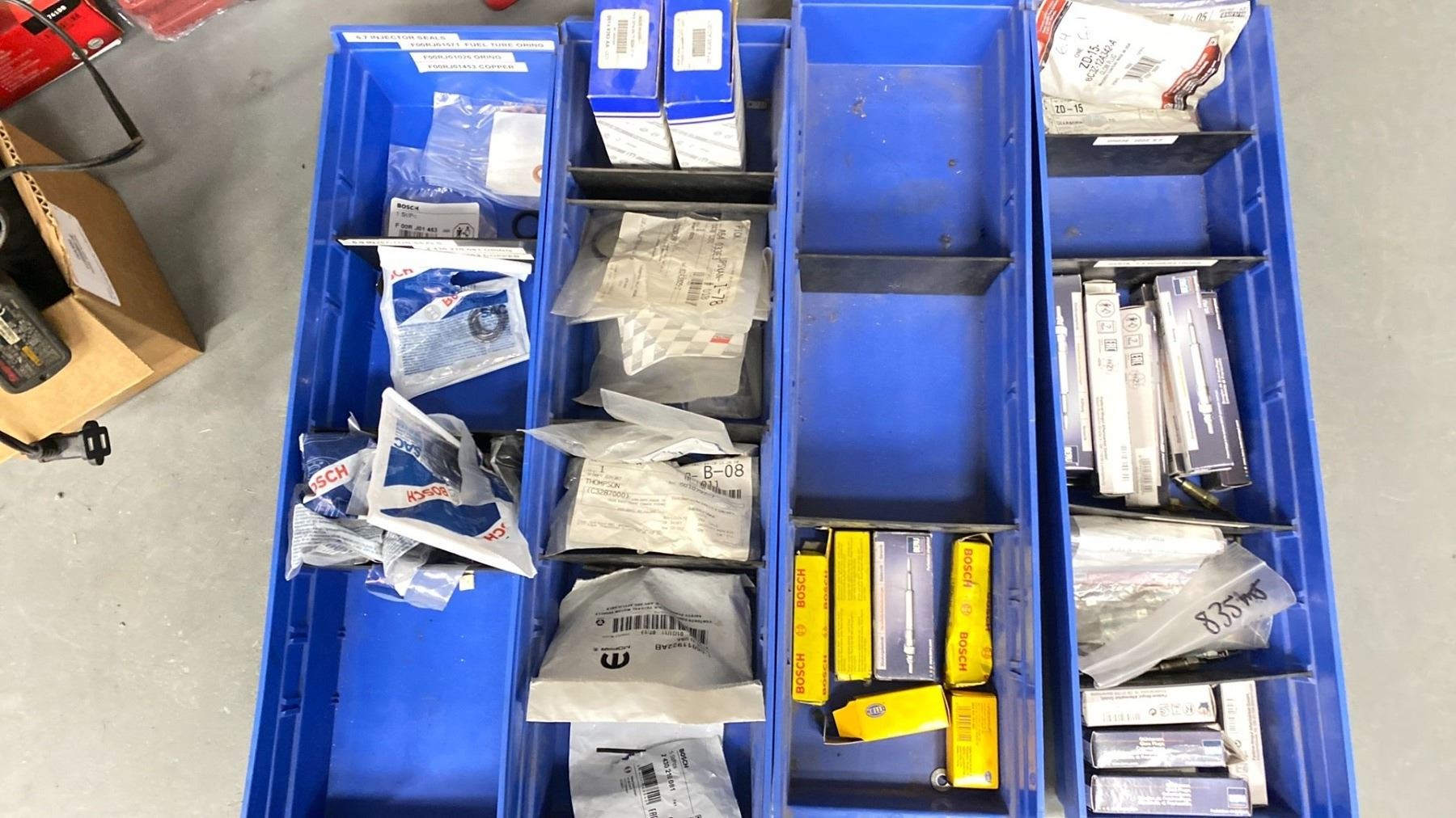 SHELF LOT OF AUTOMOTIVE PARTS. INC GASKETS, INJECTOR NOZZLES, GLOW PLUGS, INJECTOR INSTALLATION