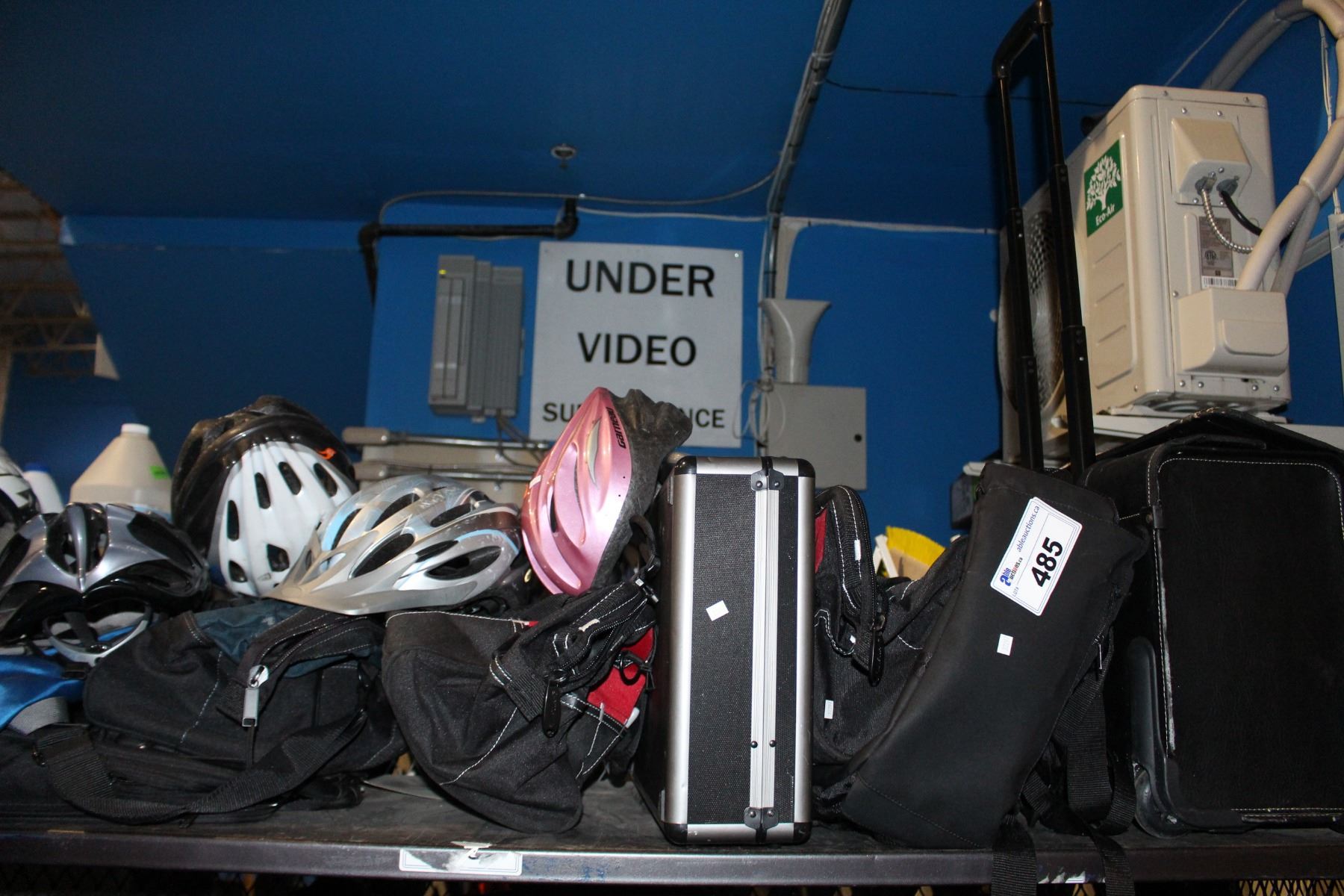 SHELF LOT OF BACKPACKS, HELMETS AND LUGGAGE