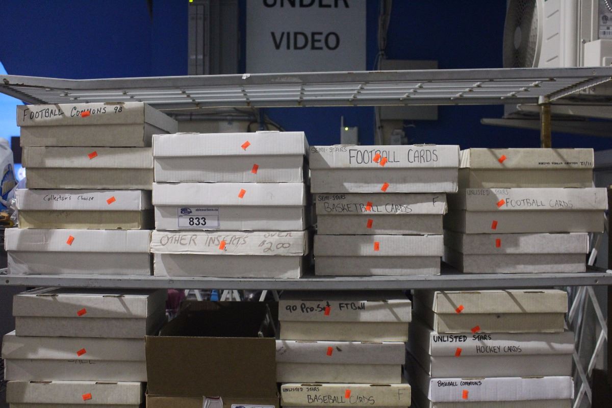 SHELF LOT OF BASEBALL, FOOTBALL AND BASKETBALL CARDS