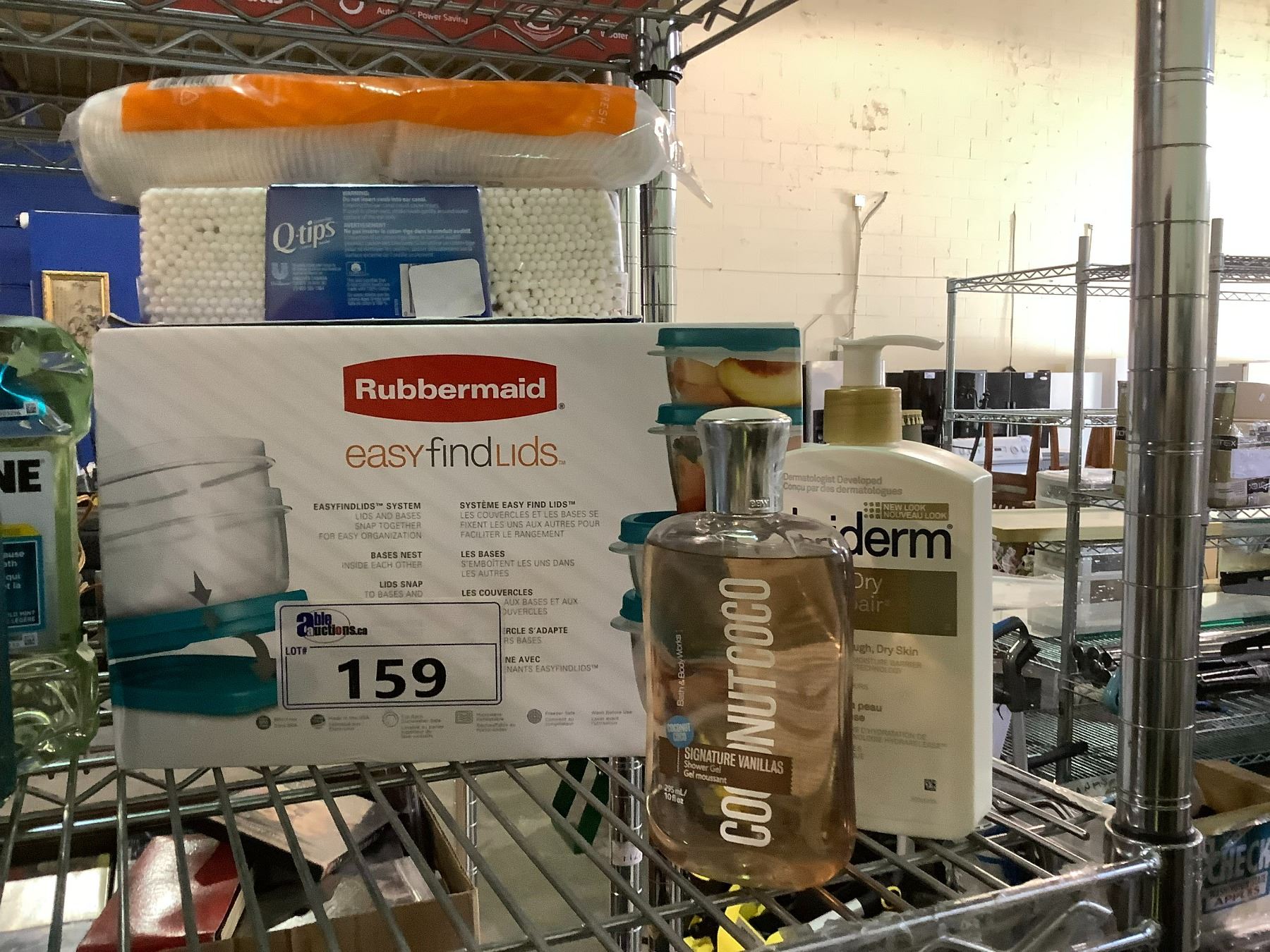 SHELF LOT OF BATHROOM PRODUCTS, SOAP, SOLUTIONS, RUBBERMAID, Q TIPS AND MORE