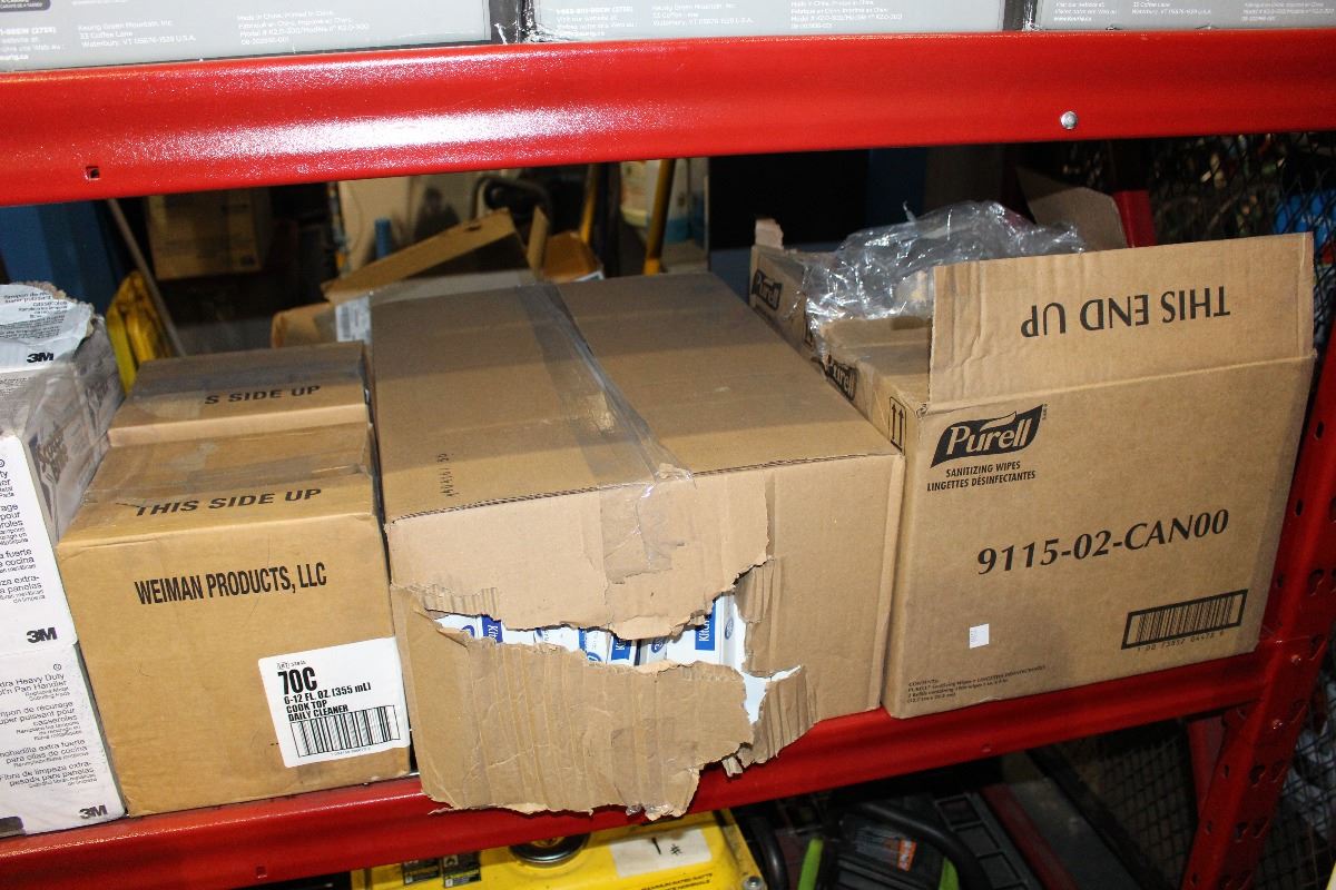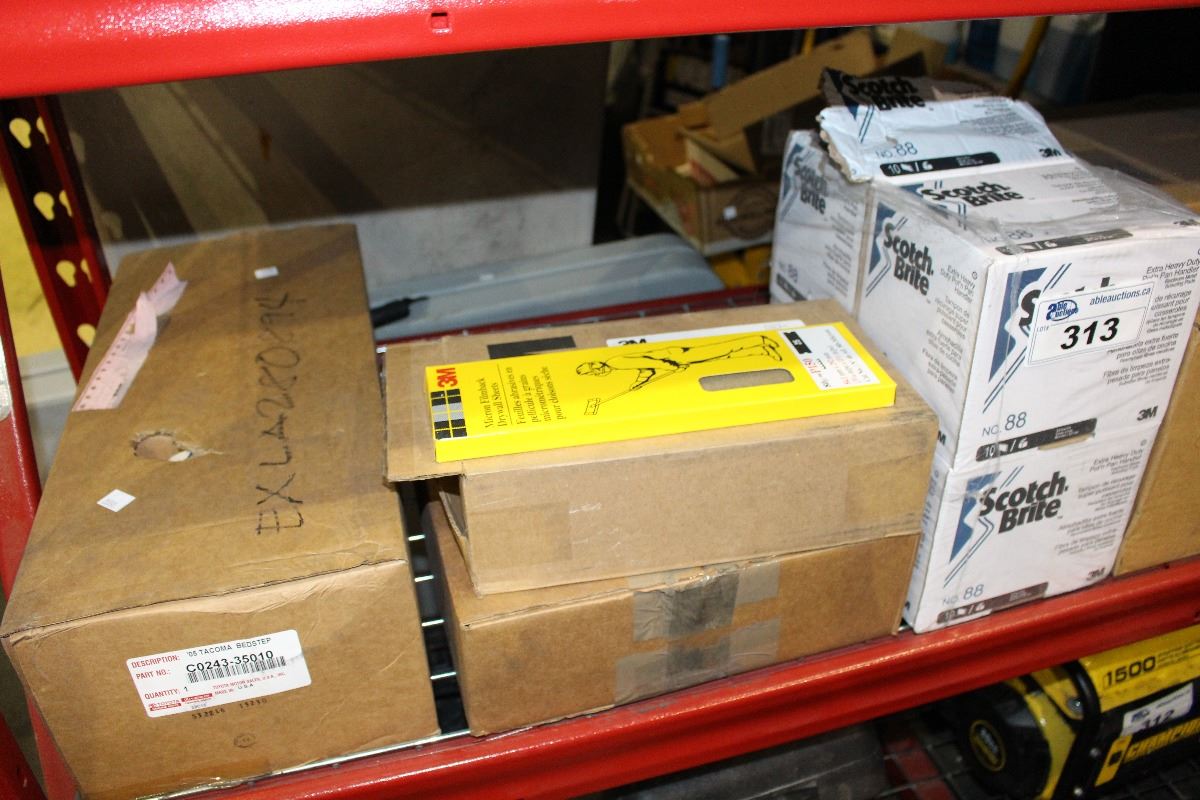 SHELF LOT OF BRAND NEW PRODUCTS INCLUDING SAND PAPER, SCOTCH BRIGHT EXTRA DUTY POT AND PAN HANDLER AND OTHER NEW PRODUCTS