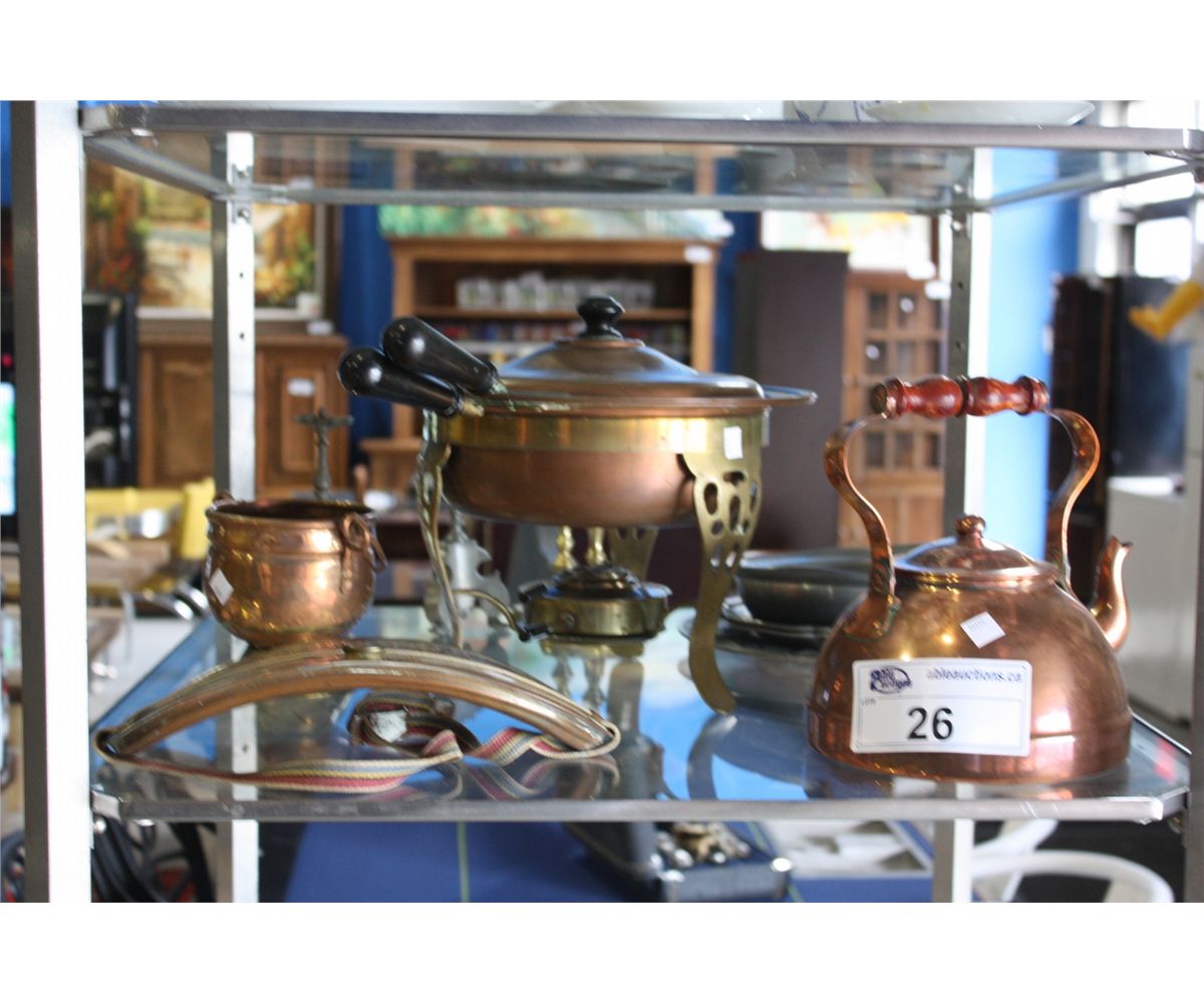 SHELF LOT OF BRASS AND COPPER ITEMS INCLUDING COPPER WARMING BELT