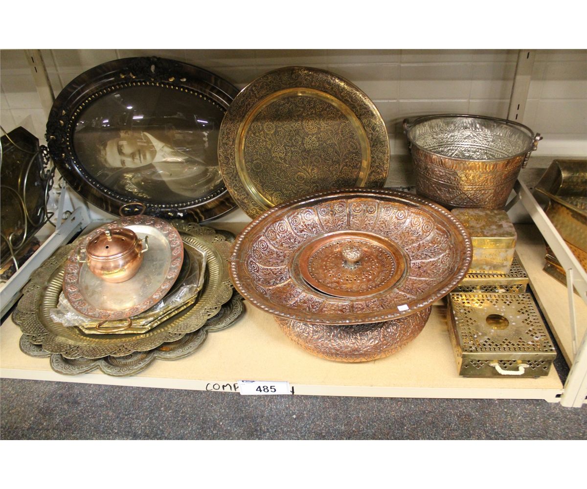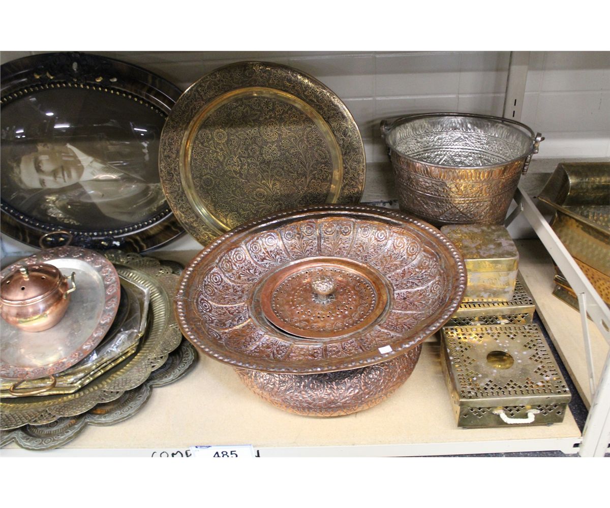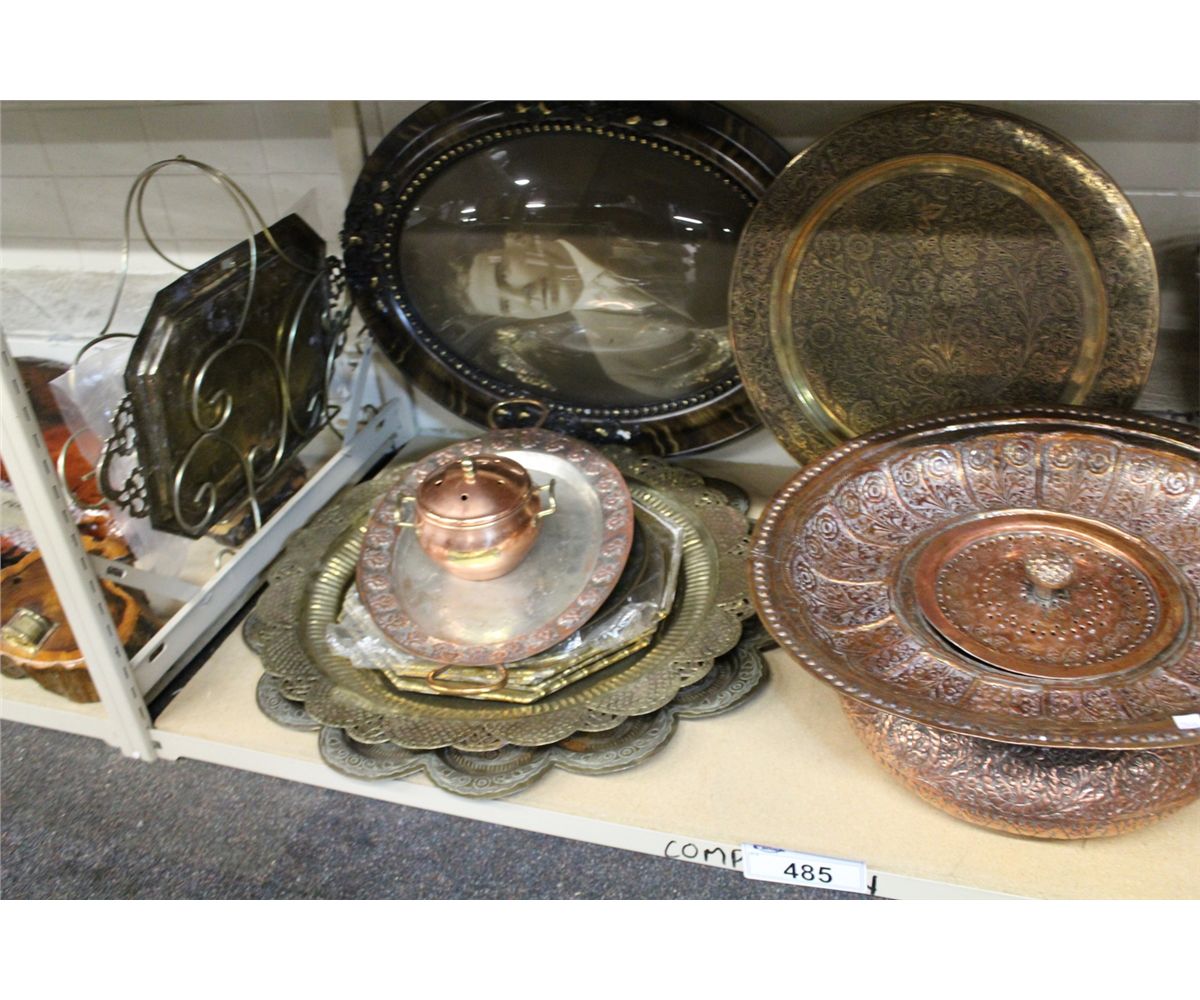 SHELF LOT OF BRASS AND COPPER SERVING DISHES