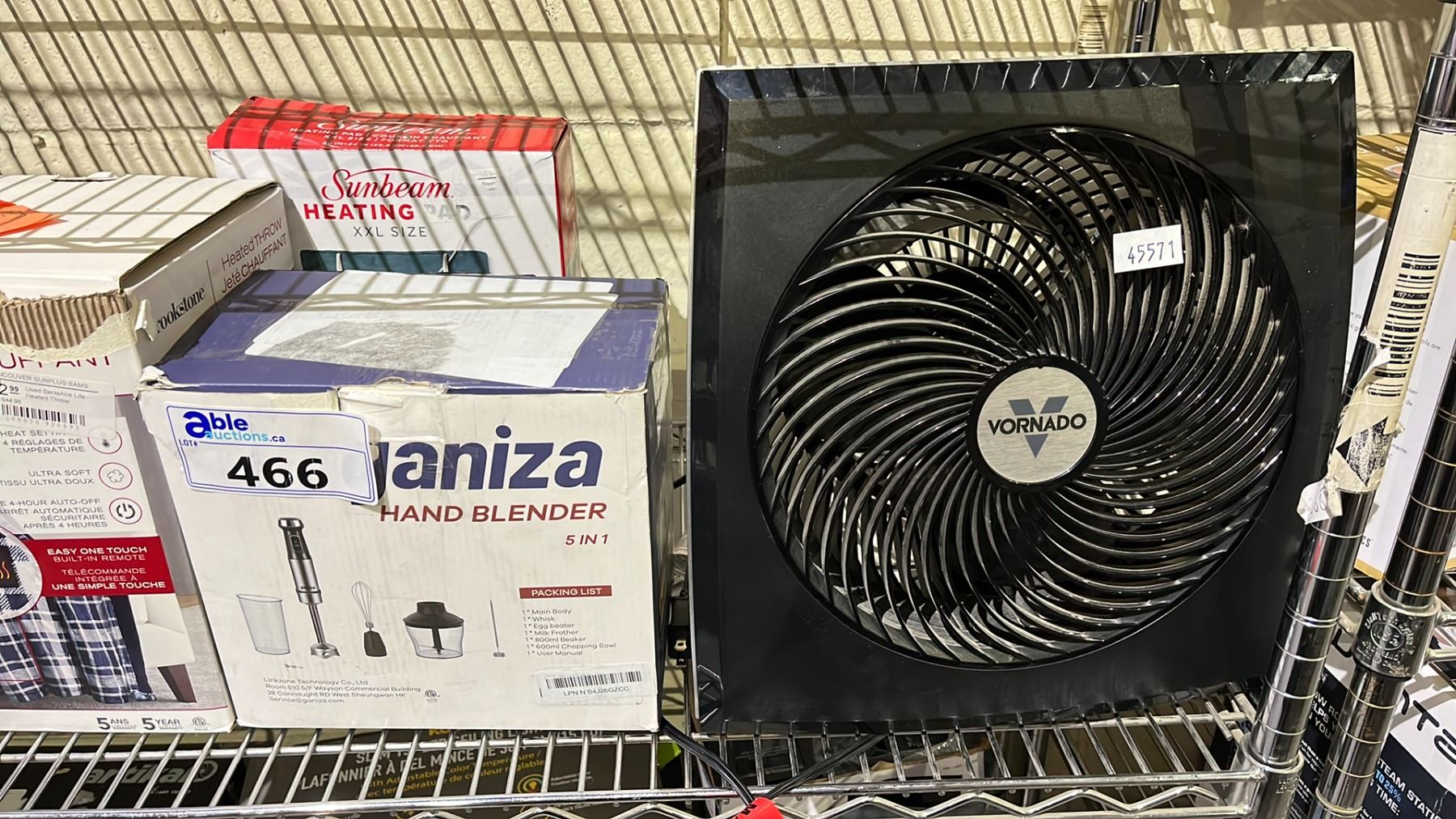SHELF LOT OF BROOKSTONE HEATED THROW, GANIZA HAND BLENDER, VORNADO FAN AND MORE