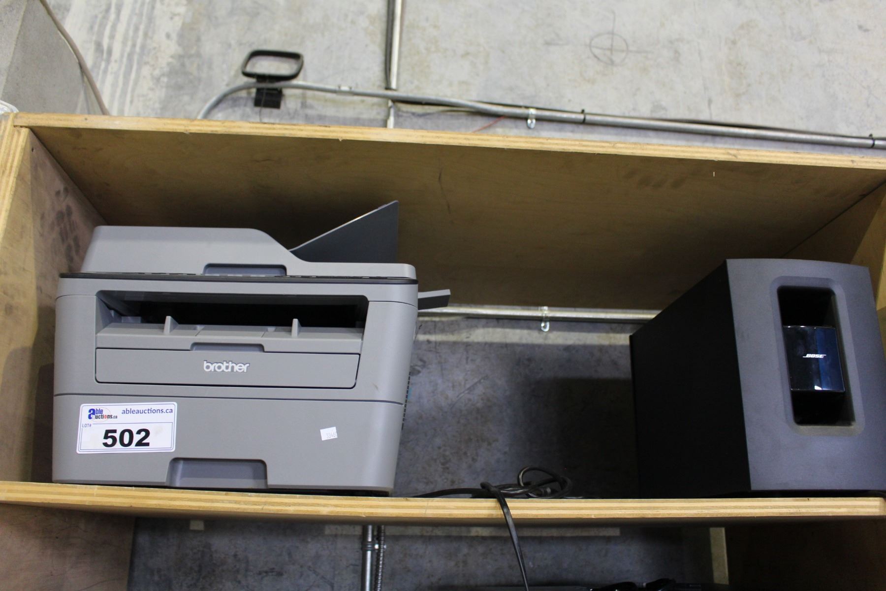 SHELF LOT OF BROTHER PRINTER AND BOSE SPEAKER