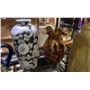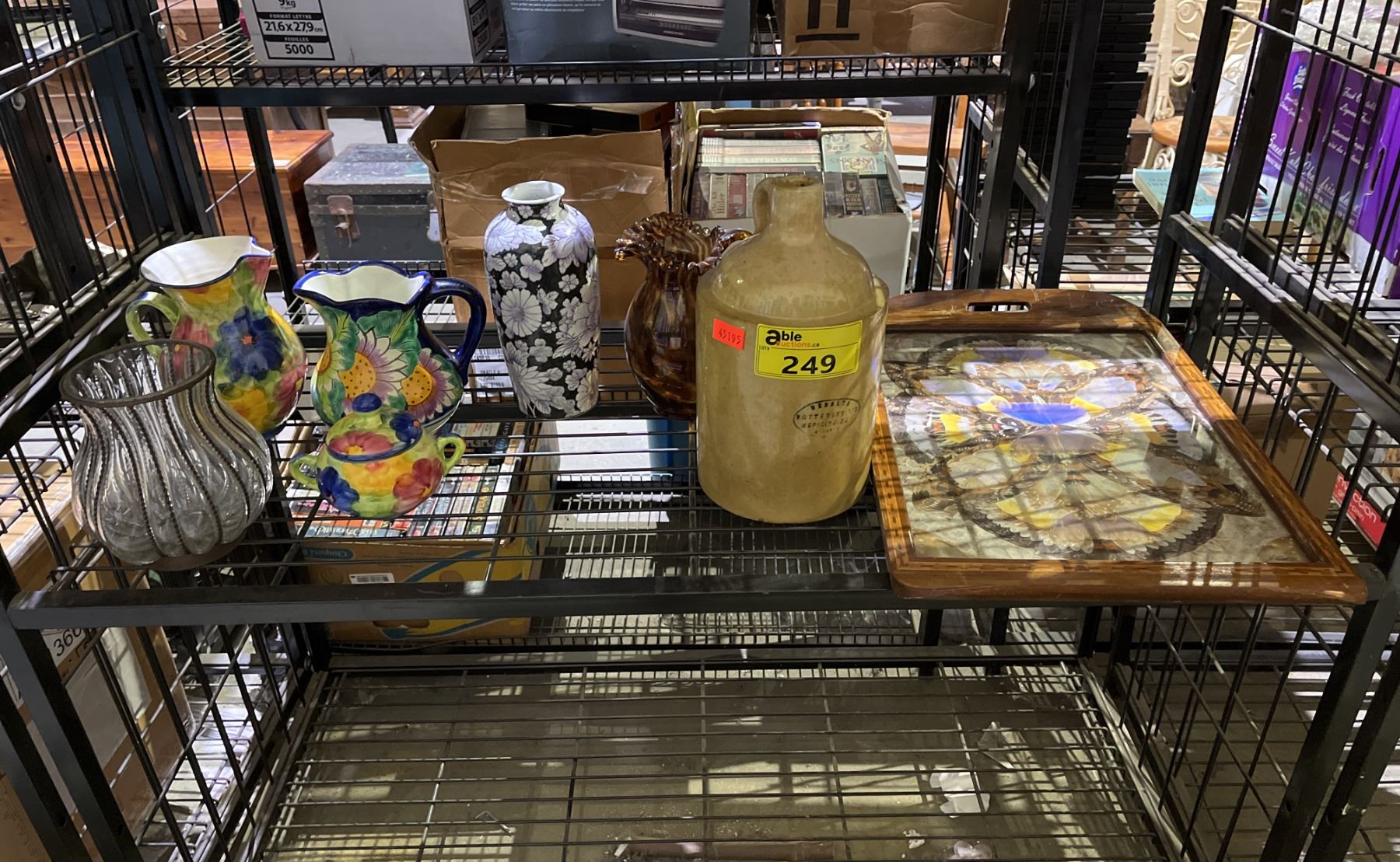 SHELF LOT OF BUTTERFLY SERVING TRAY, VASES, AND MORE