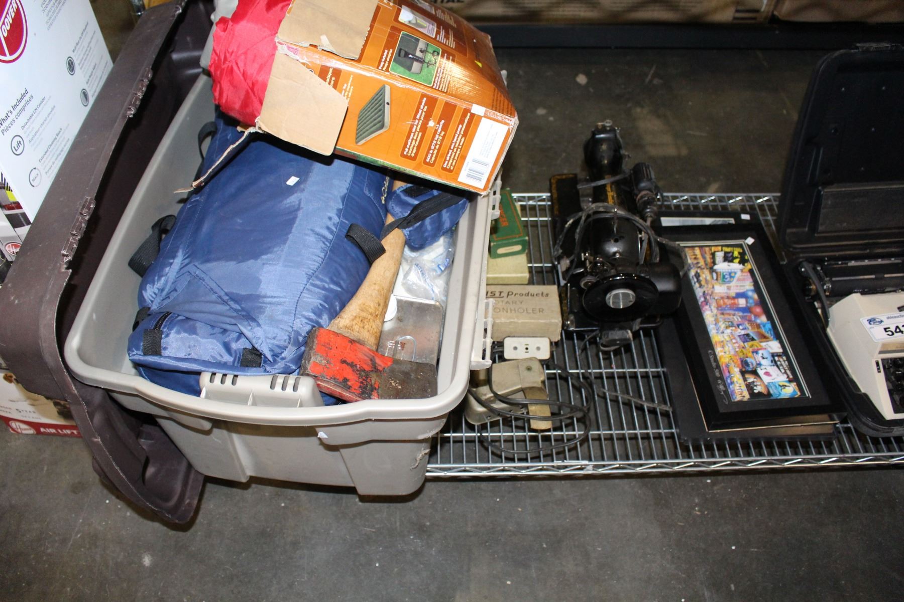 SHELF LOT OF CAMPING GEAR AND COLLECTABLES