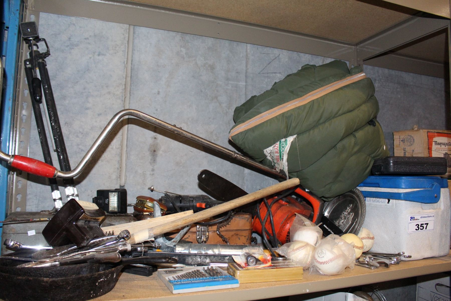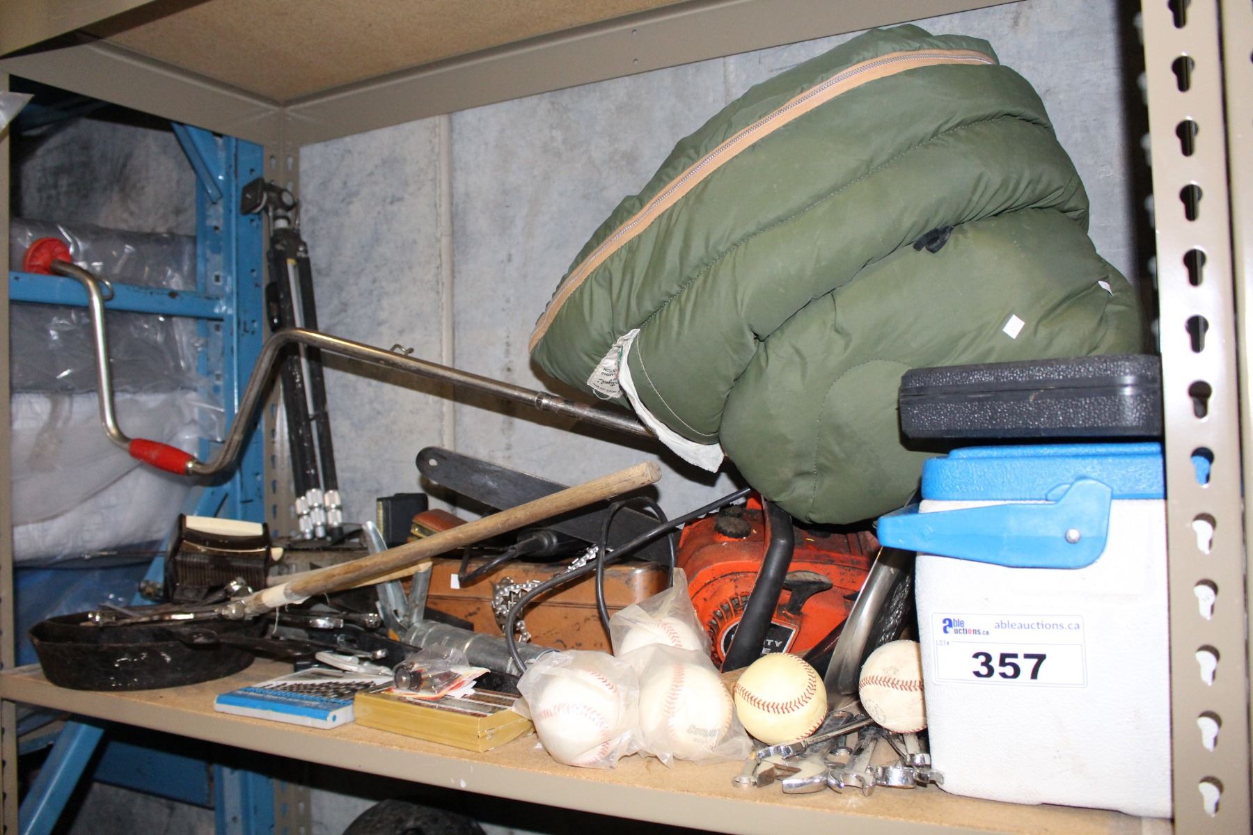 SHELF LOT OF CAMPING GEAR AND TOOLS
