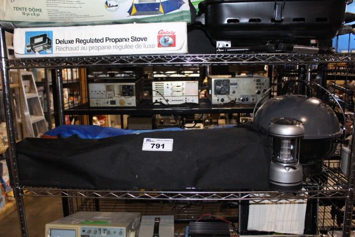 SHELF LOT OF CAMPING SUPPLIES INCLUDING COOK STOVES, TENT AND MORE