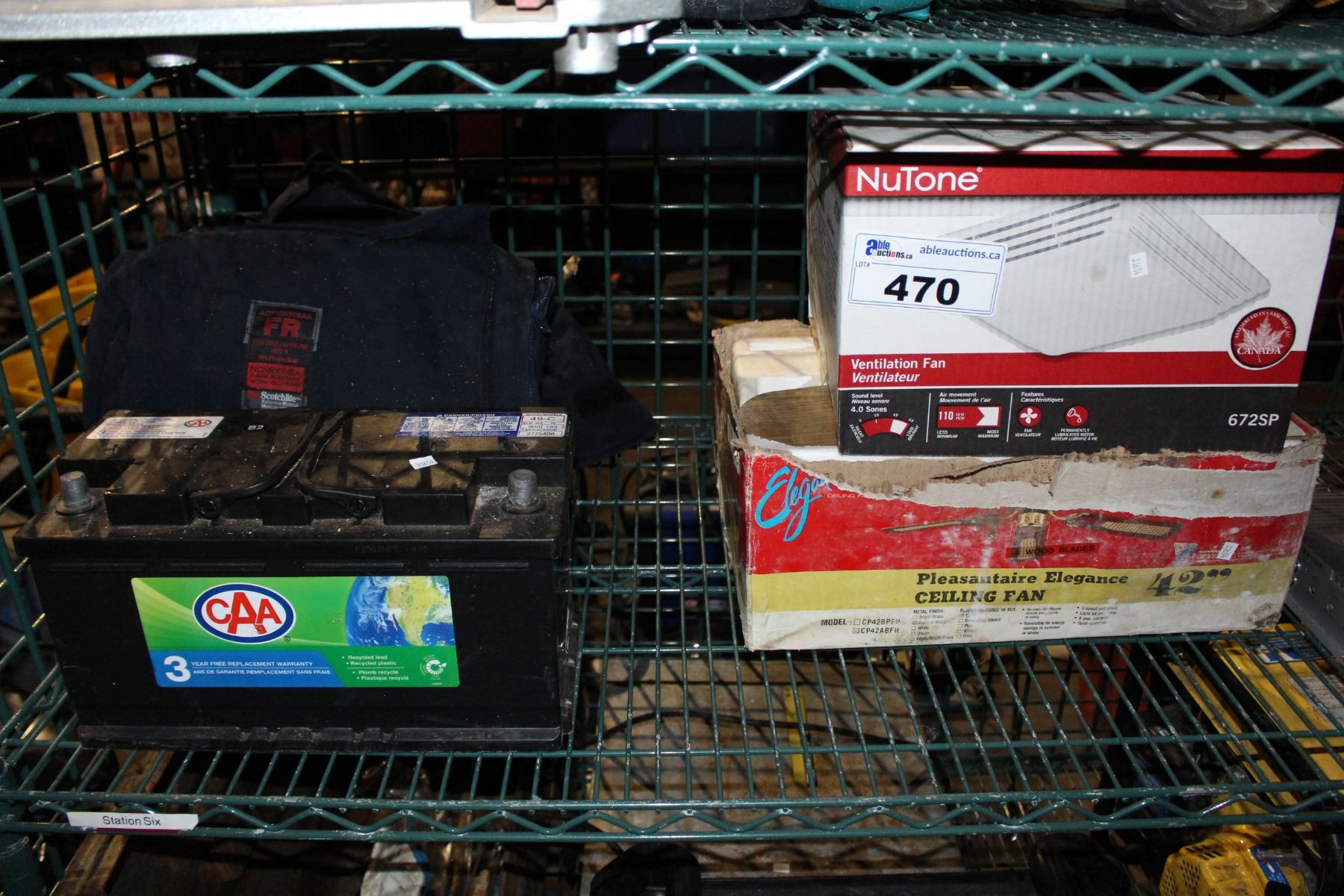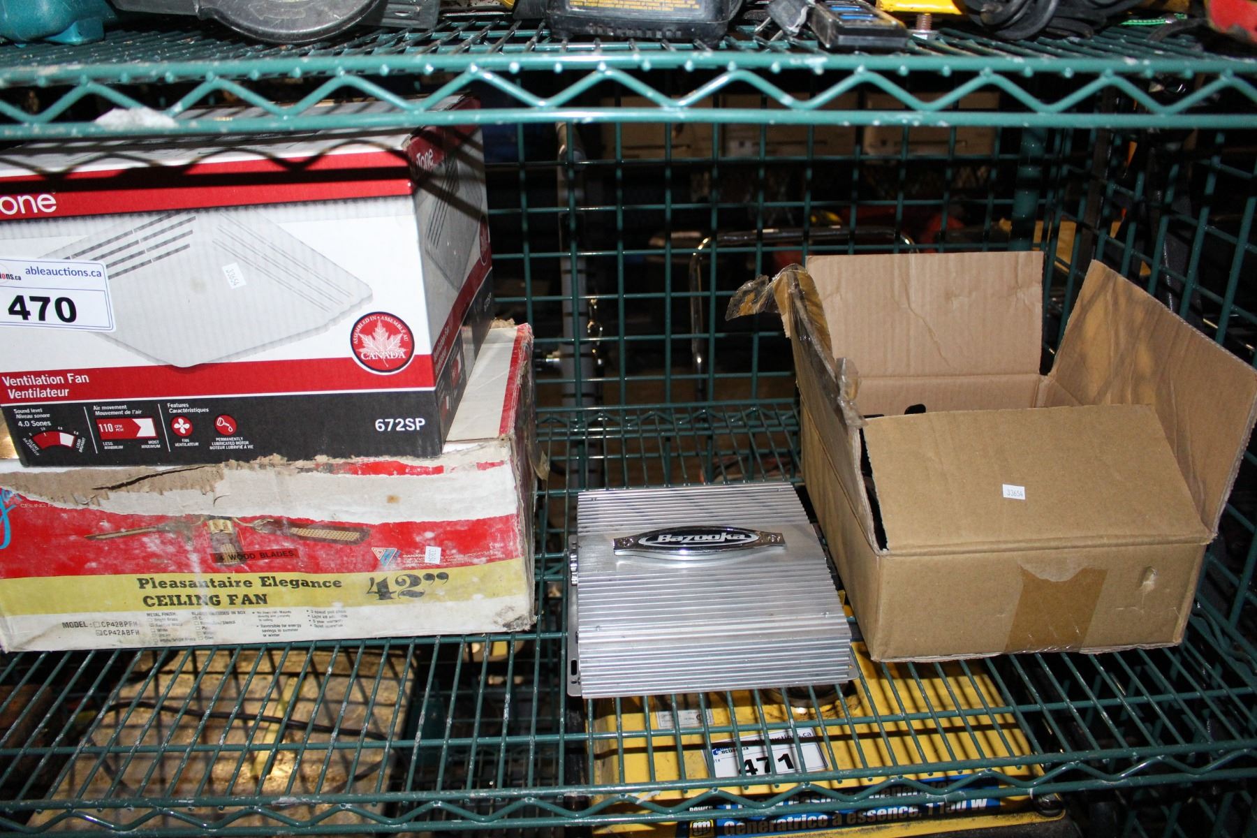 SHELF LOT OF CAR BATTERY, CEILING FAN, CAR AMP AND MORE