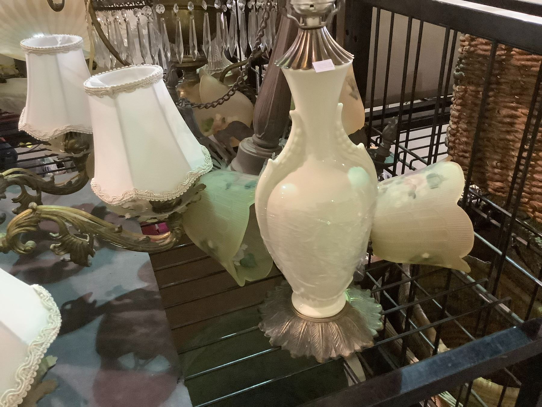 SHELF LOT OF CEILING LIGHT FIXTURES, LAMPS, AND MORE