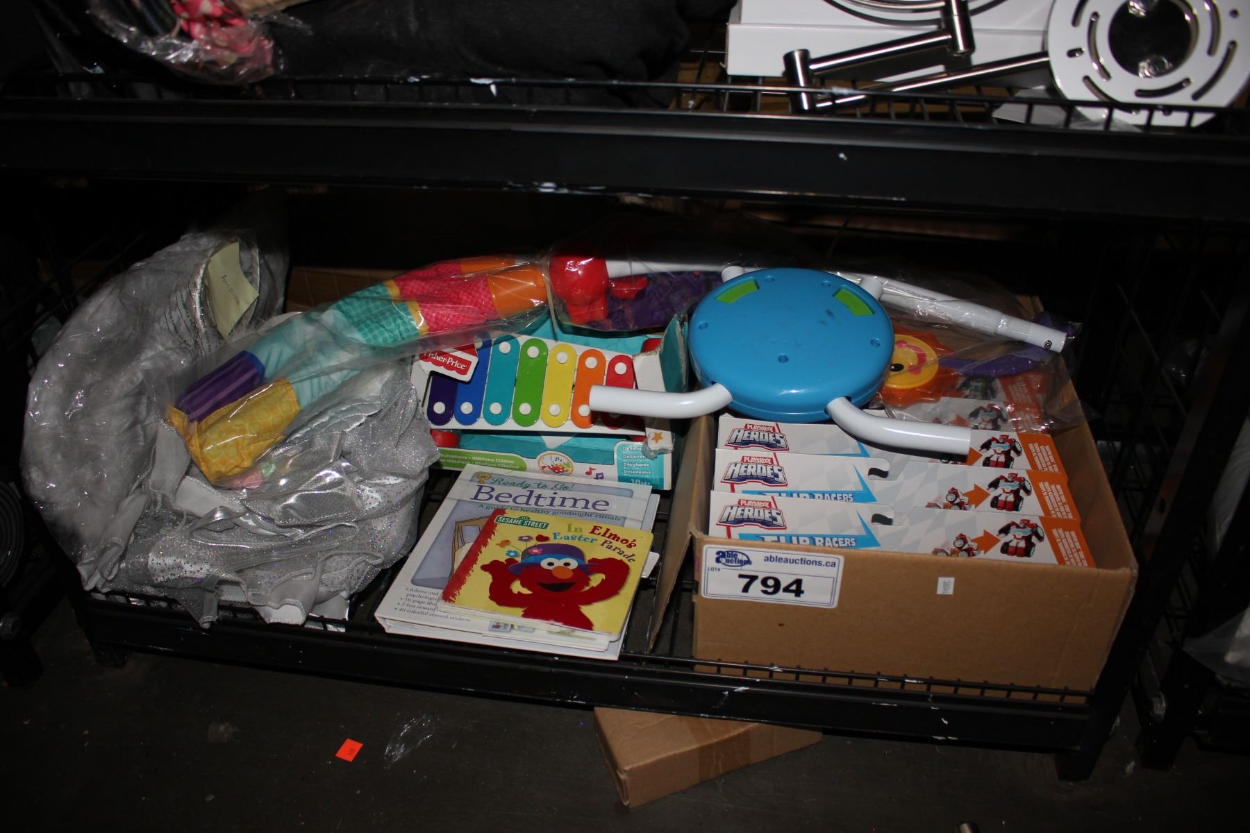 SHELF LOT OF CHILDREN'S TOYS, BOOKS AND COSTUMES