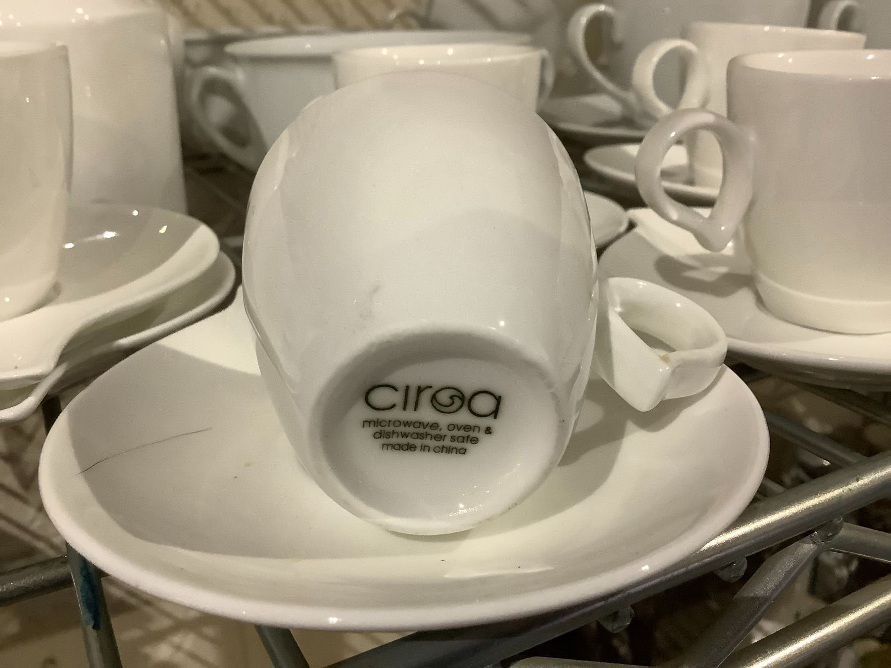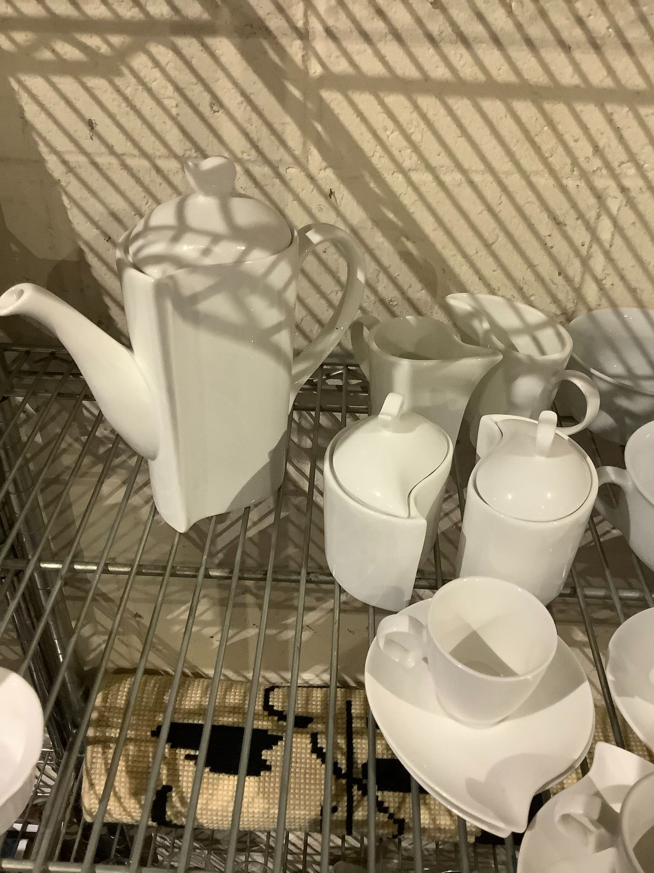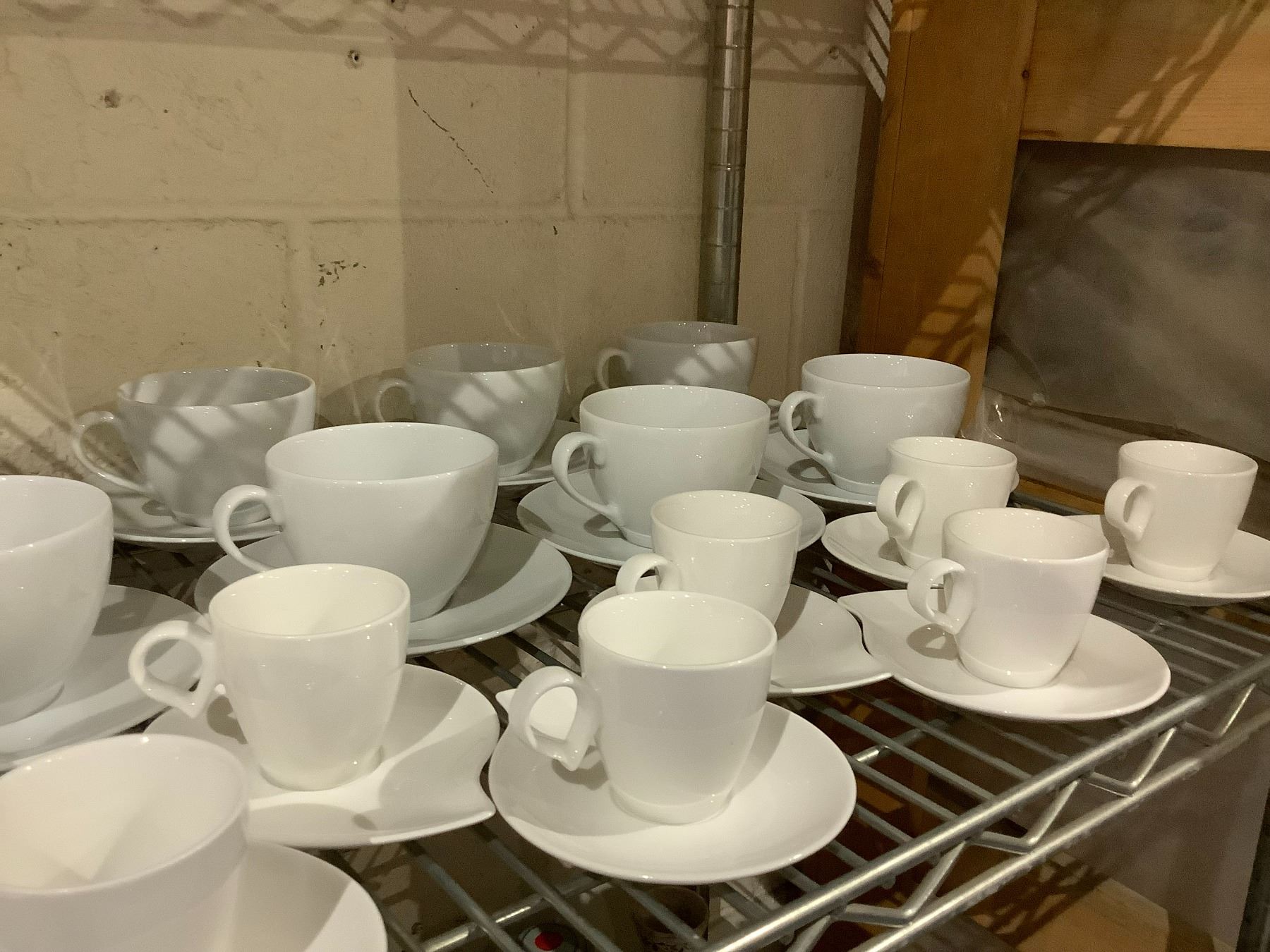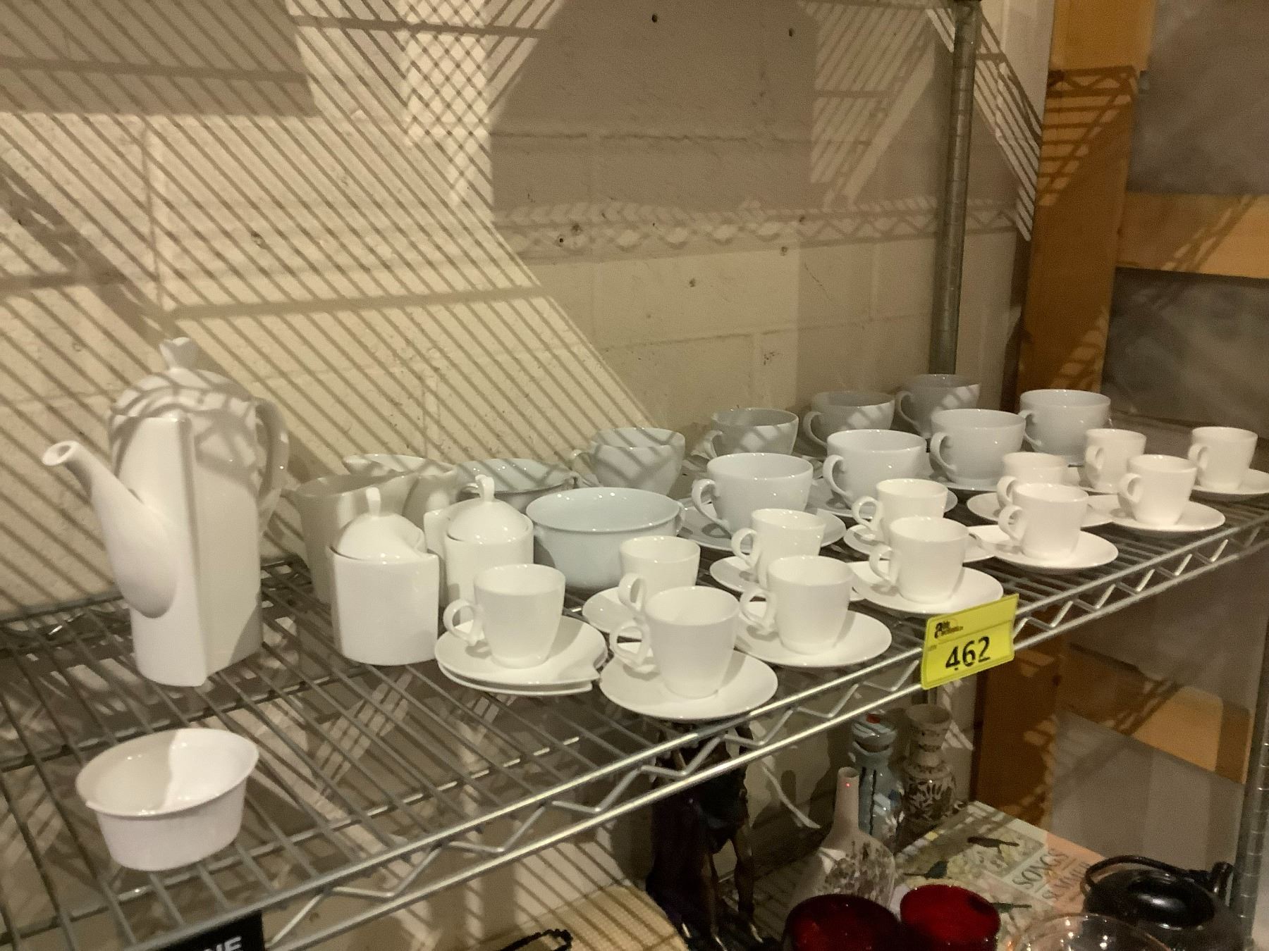 SHELF LOT OF CIROA CUPS, DEMMI TASSE CUPS, COFFEE SERVER, AND MORE